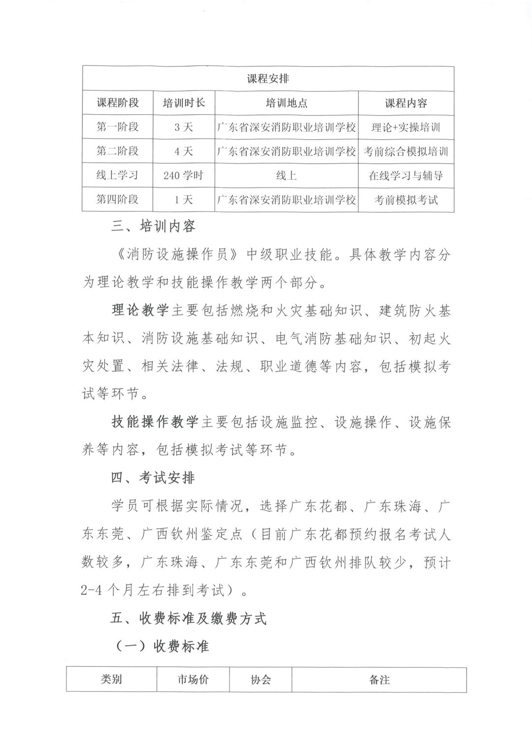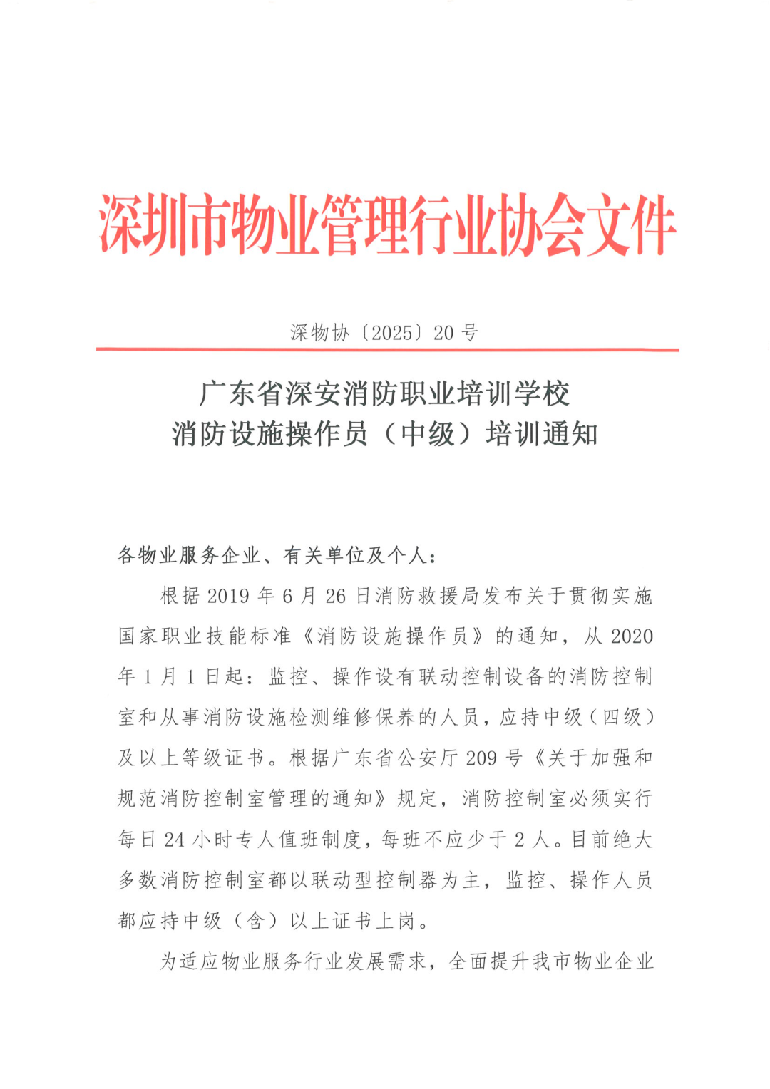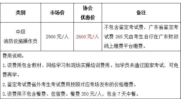 根据2019年6月26日消防救援局发布关于贯彻实施国家职业技能标准《消防设施操作员》的通知,从2020年1月1日起:监控、操作设有联动控制设备的消防控制室和从事消防设施检测维修保养的人员,应持中级(四级)及以上等级证书。根据广东省公安厅209号《关于加强和规范消防控制室管理的通知》规定,消防控制室必须实行每日24小时专人值班制度,每班不应少于2人。目前绝大多数消防控制室都以联动型控制器为主,监控、操作人员都应持中级(含)以上证书上岗。 为适应物业服务行业发展需求,全面提升我市物业企业员工职业综合素质,经向部分会员单位、物业服务企业了解,普遍存在岗位持证人员缺口大、人员培训成本较高、考试排队周期长、取证难等问题,协会本着为会员单位提供便利与优惠的原则,邀请我会会员单位广东省深安消防职业培训学校在全市举办中级消防设施操作员培训班,现就相关事项通知如下: 我会为会员企业全年度每月上中下旬各开一期培训班,学员报名后可以任意选择一期到校上课,具体每月开班时间以培训学校公众号公布为准。 第一阶段:3天,根据培训学校开班时间表,企业组织学员到校进行第一阶段综合培训。第一阶段课程结束后颁发结业证书。 第二阶段:4天,国家考试时间确定之后,培训学校向企业发出书面通知,按照书面通知约定的时间组织学员进行考前冲刺培训。 完成一、二阶段的培训并通过了特种行业鉴定站的考试后由鉴定站颁发消防设施操作员中级职业资格证书。
