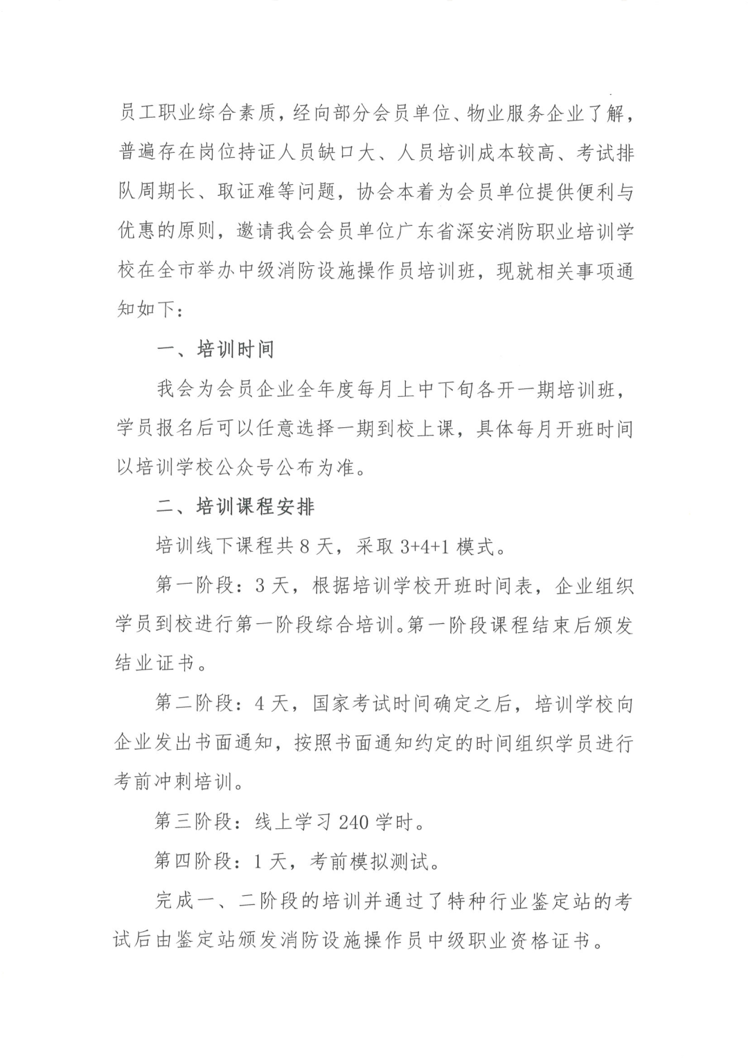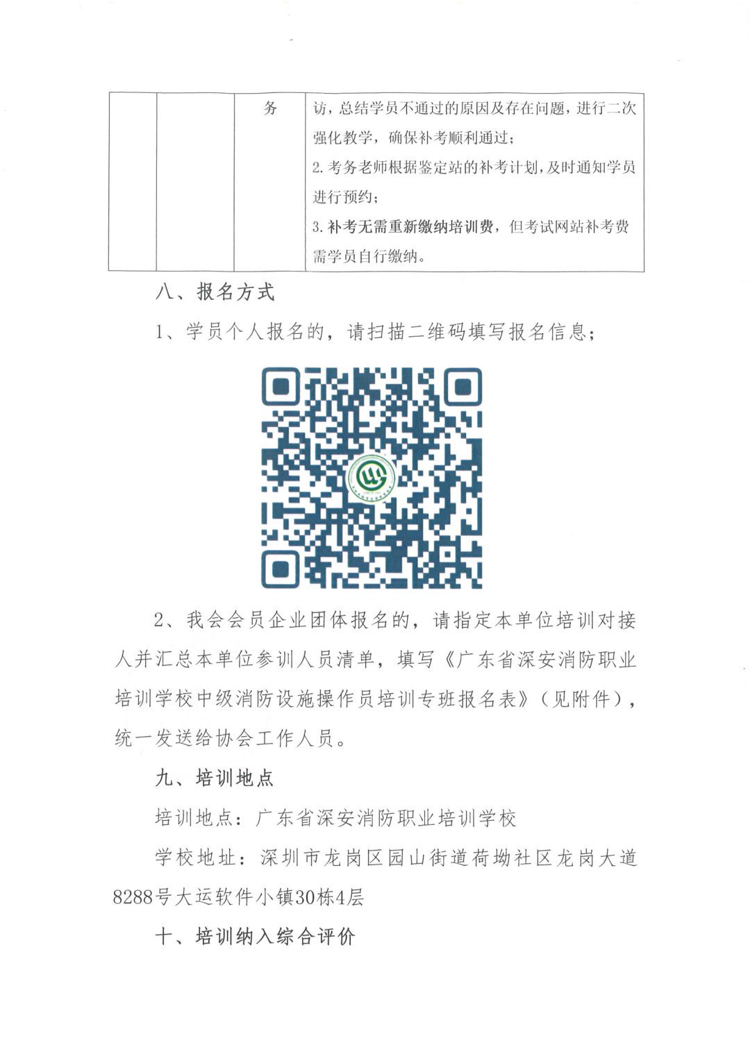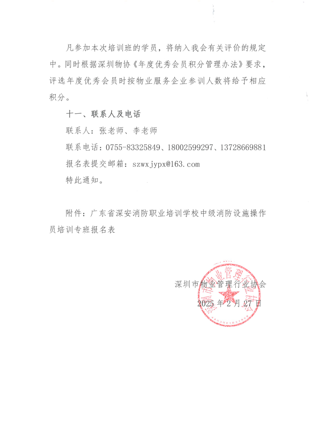 2、我会会员企业团体报名的,请指定本单位培训对接人并汇总本单位参训人员清单,填写《广东省深安消防职业培训学校中级消防设施操作员培训专班报名表》(见附件),统一发送给协会工作人员。 学校地址:深圳市龙岗区园山街道荷坳社区龙岗大道8288号大运软件小镇30栋4层 凡参加本次培训班的学员,将纳入我会有关评价的规定中。同时根据深圳物协《年度优秀会员积分管理办法》要求,评选年度优秀会员时按物业服务企业参训人数将给予相应积分。 联系电话:0755-83325849、18002599297、13728669881 附件:广东省深安消防职业培训学校中级消防设施操作员培训专班报名表(请点击“阅读原文下载附件”)通知原文如下: