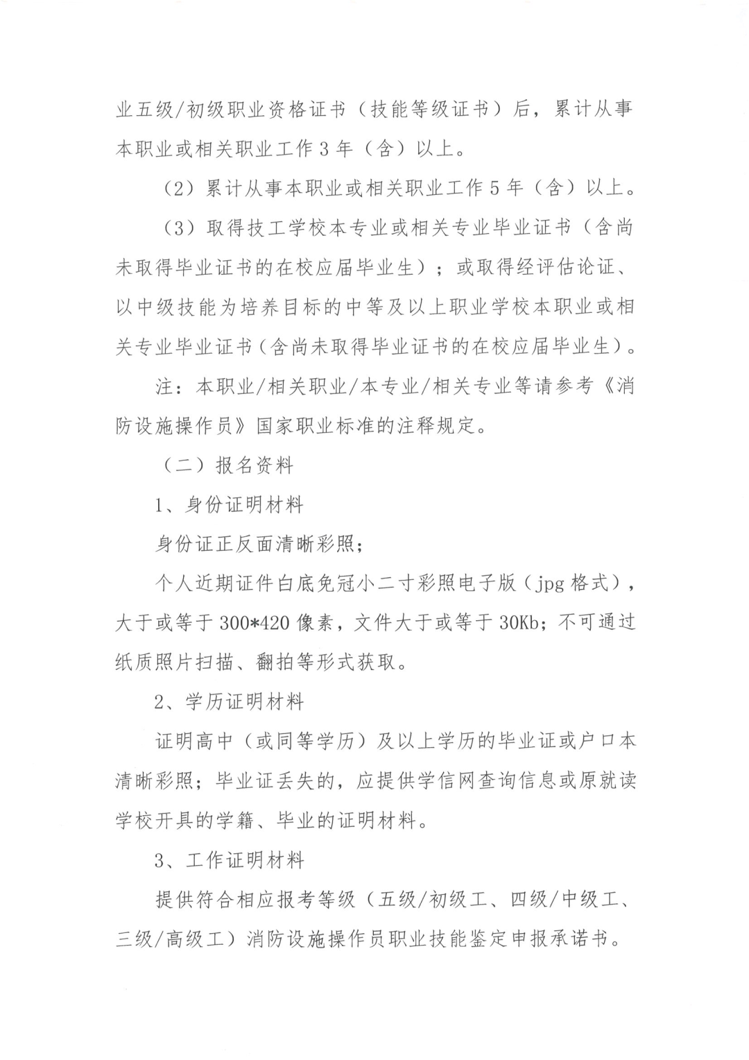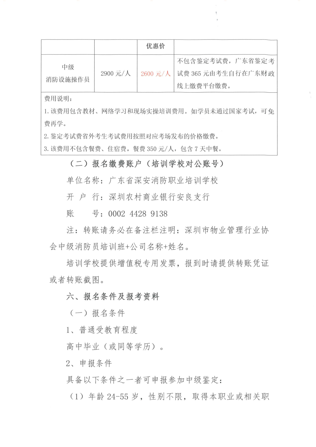 注:转账请务必在备注栏注明:深圳市物业管理行业协会中级消防员培训班+公司名称+姓名。 培训学校提供增值税专用发票,报到时请提供转账凭证或者转账截图。 (1)年龄24-55岁,性别不限,取得本职业或相关职业五级/初级职业资格证书(技能等级证书)后,累计从事本职业或相关职业工作3年(含)以上。 (2)累计从事本职业或相关职业工作5年(含)以上。 (3)取得技工学校本专业或相关专业毕业证书(含尚未取得毕业证书的在校应届毕业生);或取得经评估论证、以中级技能为培养目标的中等及以上职业学校本职业或相关专业毕业证书(含尚未取得毕业证书的在校应届毕业生)。 注:本职业/相关职业/本专业/相关专业等请参考《消防设施操作员》国家职业标准的注释规定。 个人近期证件白底免冠小二寸彩照电子版(jpg格式),大于或等于300*420像素,文件大于或等于30Kb;不可通过纸质照片扫描、翻拍等形式获取。 证明高中(或同等学历)及以上学历的毕业证或户口本清晰彩照;毕业证丢失的,应提供学信网查询信息或原就读学校开具的学籍、毕业的证明材料。 提供符合相应报考等级(五级/初级工、四级/中级工、三级/高级工)消防设施操作员职业技能鉴定申报承诺书。
