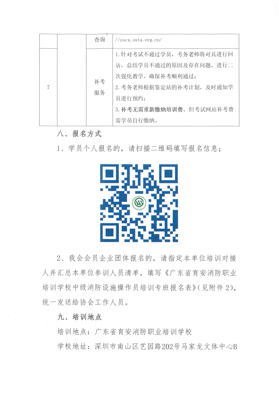 2、我会会员企业团体报名的,请指定本单位培训对接人并汇总本单位参训人员清单,填写《广东省育安消防职业培训学校中级消防设施操作员培训专班报名表》(见附件2),统一发送给协会工作人员。 学校地址:深圳市南山区艺园路202号马家龙文体中心B栋三层 凡参加本次培训班的学员,将纳入我会有关评价的规定中。同时根据深圳物协《会员积分管理办法》要求,评选年度优秀会员时将按物业服务企业参训人数给予相应积分。 联系电话:0755-83325849、18002599297、13728669881 2、广东省育安消防职业培训学校中级消防设施操作员培训专班报名表通知原文如下: