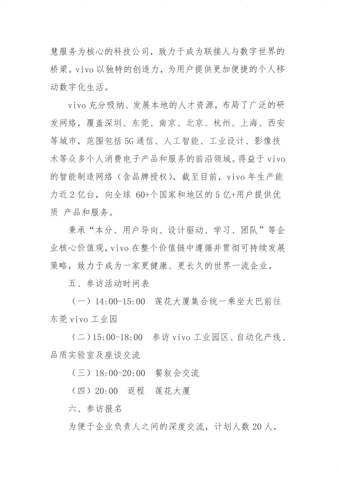 60+个国家和地区的5亿+用户提供优质 产品和服务。 秉承“本分、用户导向、设计驱动、学习、团队”等企业核心价值观,vivo在整个价值链中遵循并贯彻可持续发展策略,致力于成为一家更健康、更长久的世界一流企业。 (一)14:00-15:00 莲花大厦集合统一乘坐大巴前往东莞vivo工业园 (二)15:00-18:00 参访vivo工业园区、自动化产线、品质实验室及座谈交流 为便于企业负责人之间的深度交流,计划人数20人,活动不收取任何费用,扫描下方二维码即可报名。