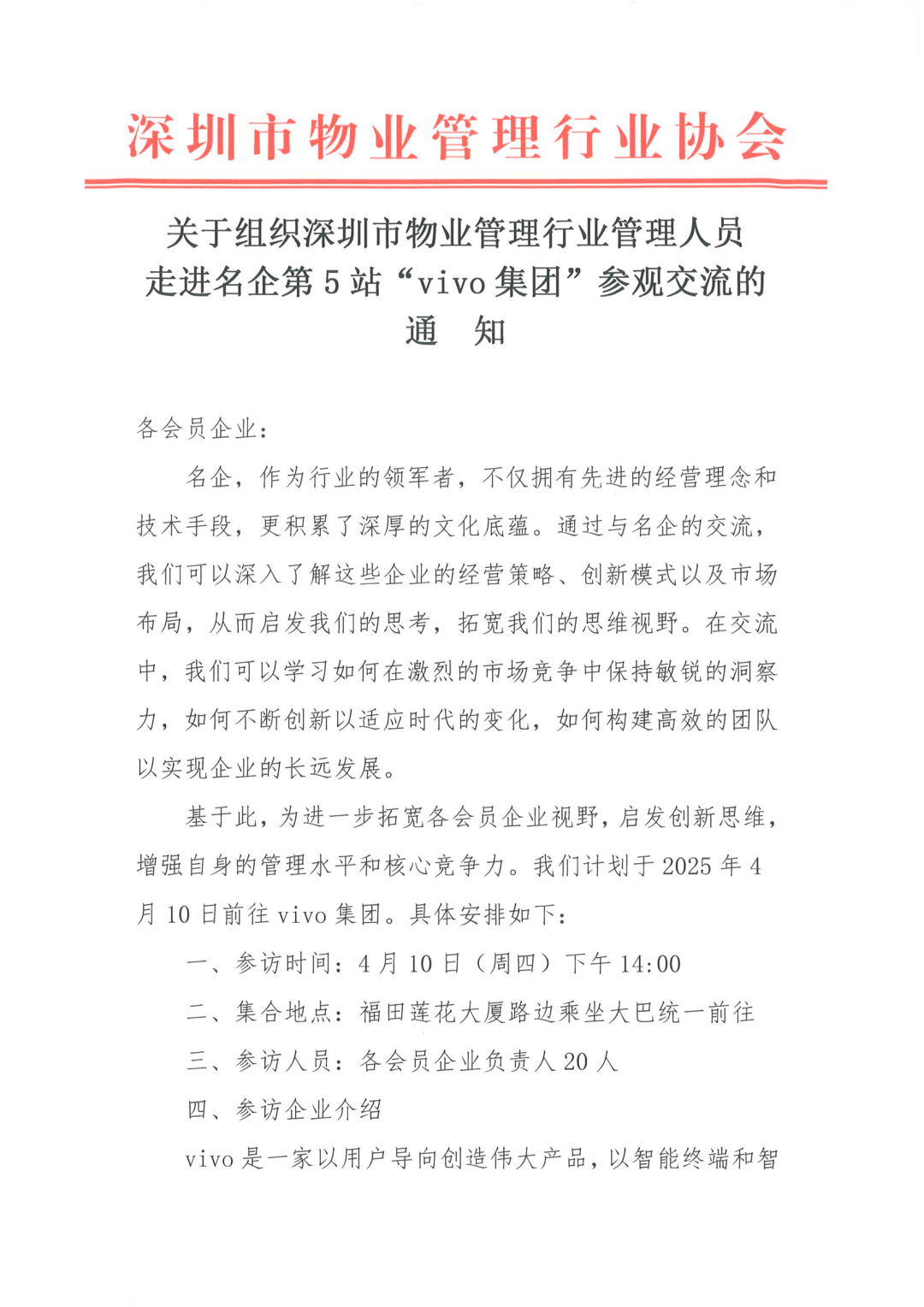关于组织深圳市物业管理行业管理人员走进名企第5站“vivo集团”参观交流的通知
