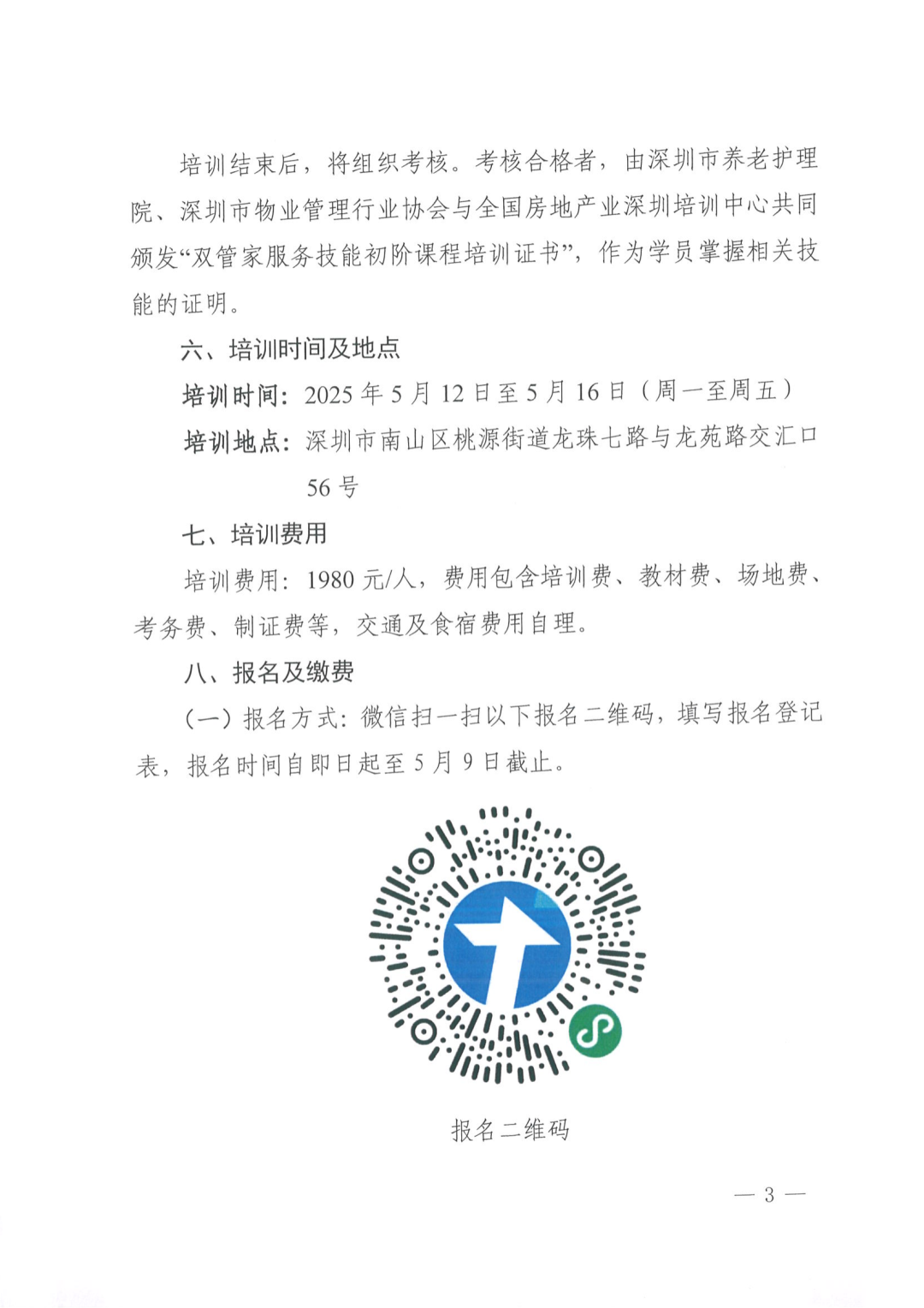随着社会的快速发展和人口老龄化的加剧,“物业+养老”模式逐渐成为物业服务行业的新趋势。为适应这一行业发展需求,全面提升物业管理与养老服务人员的综合素质与专业技能,培养实用型的双管家服务人才,深圳市养老护理院携手深圳市物业管理行业协会与全国房地产业深圳培训中心,拟定于5月12日-16日在深圳市举办新模式驱动“物业+养老”行业革新赋能提升班——双管家服务技能初阶课程。现将有关事项通知如下: 本次培训将围绕“物业+养老”双管家服务技能展开,包括但不限于以下内容: 培训方式采用理论讲授、案例分析、小组讨论、模拟演练、项目参访等多种形式相结合。培训周期为5天(5月12日至5月16日),包括脱产培训和项目实地考察两部分。 由养老服务行业资深专家、物业管理行业资深专家、职业培训师及实践经验丰富的企业高管共同组成师资团队,确保培训内容的权威性和实用性。 培训结束后,将组织考核。考核合格者,由深圳市养老护理院、深圳市物业管理行业协会与全国房地产业深圳培训中心共同颁发“双管家服务技能初阶课程培训证书”,作为学员掌握相关技能的证明。 培训时间:2025年5月12日至5月16日(周一至周五) 培训地点:深圳市南山区桃源街道龙珠七路与龙苑路交汇口56号 培训费用:1980元/人,费用包含培训费、教材费、场地费、考务费、制证费等,交通及食宿费用自理。 (一)报名方式:微信扫一扫以下报名二维码,填写报名登记表,报名时间自即日起至5月9日截止。