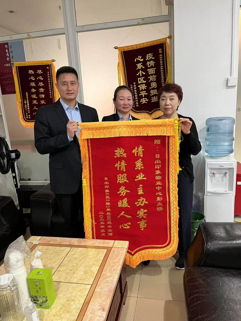 2025年4月2日,日出印象A3-2-602业主苑女士将一面印有“情系业主办实事,热情服务暖人心”的锦旗送到家华永安物业服务中心,亲手交到物业服务中心客服主管彭嫔手中,以此表达对物业团队,尤其是彭嫔尽职尽责、暖心服务的真挚感谢。
