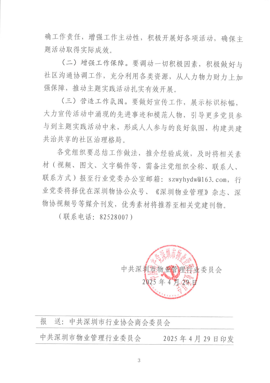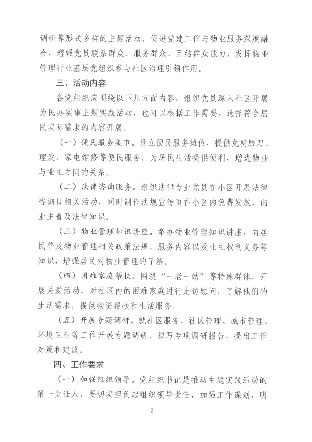 市各物业企业党组织,市物业管理行业各经济组织、社会组织党组织: 为推动深入贯彻中央八项规定精神学习教育取得扎实成效,充分发挥物业管理行业党支部的战斗堡垒作用和党员的先锋模范作用,切实解决社区居民生活中的实际问题,决定在全市物业管理行业开展党员进社区、为民办实事主题实践活动。现通知如下: 坚持以习近平新时代中国特色社会主义思想为指导,贯彻以人民为中心的发展思想,发挥物业管理行业专业优势和行业特色,以解决社区居民和服务对象实际需求为导向,组织和动员物业管理行业党员深入社区,通过开展党员志愿服务、专题调研等形式多样的主题活动,促进党建工作与物业服务深度融合,增强党员联系群众、服务群众、团结群众能力,发挥物业管理行业基层党组织参与社区治理引领作用。 各党组织应围绕以下几方面内容,组织党员深入社区开展为民办实事主题实践活动,也可以根据工作需要,选择符合居民实际需求的内容开展。 (一)便民服务集市。设立便民服务摊位,提供免费磨刀、理发、家电维修等便民服务,为居民生活提供便利,增进物业与业主之间的关系。 (二)法律咨询服务。组织法律专业党员在小区开展法律咨询日相关活动,同时制作法规宣传页在小区内免费发放,向业主普及法律知识。 (三)物业管理知识讲座。举办物业管理知识讲座,向居民普及物业管理相关政策法规、服务内容以及业主权利义务等知识,增强居民对物业管理的了解。 (四)困难家庭帮扶。围绕“一老一幼”等特殊群体,开展关爱活动,对社区内的困难家庭进行走访慰问,了解他们的生活需求,提供物资帮扶和生活服务。 (五)开展专题调研。就社区服务、社区管理、城市管理、环境卫生等工作开展专题调研,拟写专项调研报告,提出工作对策和建议。 (一)加强组织领导。党组织书记是推动主题实践活动的第一责任人,要切实担负起组织领导责任,加强工作谋划,明确工作责任,增强工作主动性,积极开展好各项活动,确保主题活动取得实际成效。 (二)增强工作保障。要调动一切积极因素,积极做好与社区沟通协调工作,充分利用各类资源,从人力物力财力上加强保障,推动主题实践活动扎实有效开展。 (三)营造工作氛围。要做好宣传工作,展示标识标幅,大力宣传活动中涌现的先进事迹和模范人物,引导更多党员参与到主题实践活动中来,形成人人参与的良好氛围,构建共建共治共享的社区治理格局。 各党组织要总结工作做法,推介经验成效,及时将相关素材(视频、图文、文字稿件等,需备注党组织全称、联系人、联系方式)报至行业党委办公室邮箱:szwyhydw@163.com,行业党委将择优在深圳物协公众号、《深圳物业管理》杂志、深物协视频号等媒介刊发,优秀素材将推荐至相关党建刊物。通知原文如下: