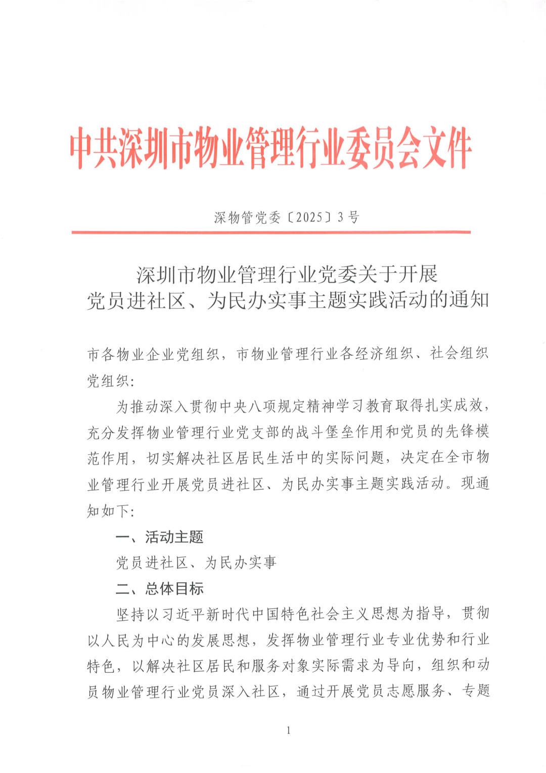 深圳市物业管理行业党委关于开展党员进社区、为民办实事主题实践活动的通知