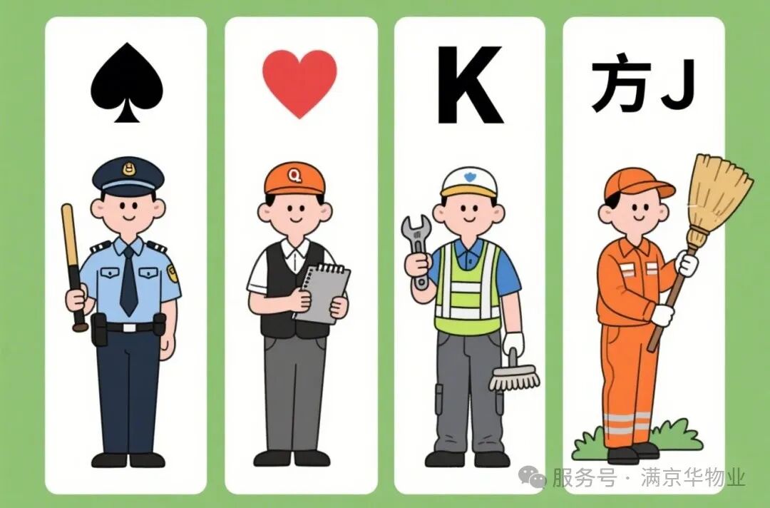 五一假期来临,当大多数人享受悠闲时光时,有一群“扑克牌守护者”始终在线。他们用不同的“花色技能”,默默打理着社区生活的每一处。今天,让我们翻开这副“物业扑克牌”,揭秘平凡岗位的“王牌力量”!