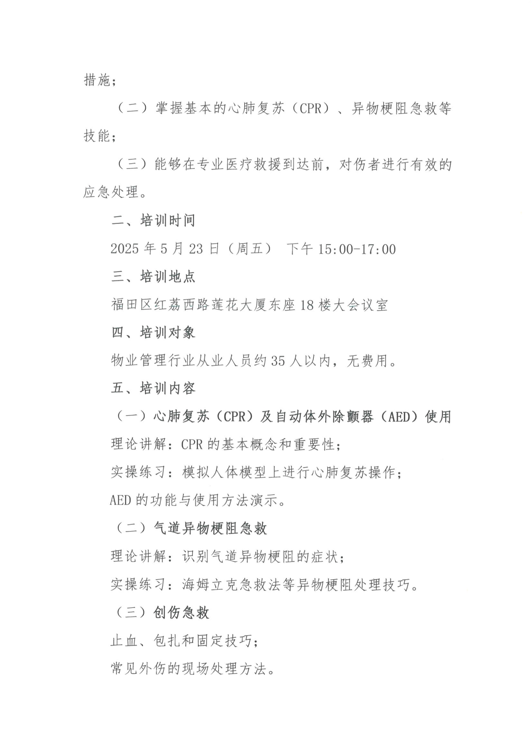 为增强物业从业人员在突发事件中的快速反应能力,最大限度减少人员伤亡和财产损失。通过合规培训规避因急救措施不当引发的法律纠纷,减少物业管理的责任盲区。避免因突发事件处理滞后导致的负面舆情,维护社区和谐稳定。深圳市物业管理行业协会联合南山区公益救援志愿者联合会定于5月23日下午组织第二场公益培训“应急急救知识”培训。具体安排如下: 通过系统的急救知识培训,使物业从业人员具备以下能力: (一)识别突发医疗事件的严重性,并采取适当的初步措施; (二)掌握基本的心肺复苏(CPR)、异物梗阻急救等技能; (三)能够在专业医疗救援到达前,对伤者进行有效的应急处理。 2025年5月23日(周五) 下午15:00-17:00 (一)心肺复苏(CPR)及自动体外除颤器(AED)使用 低血糖、卒中(中风)、抽搐(癫痫)、中暑等常见急症的识别和处置。 (一)理论讲授:结合多媒体展示急救知识,增强培训的直观性和互动性; (二)实操演练:通过模拟场景和真人互动,确保学员掌握实际操作技巧; (三)问题答疑:培训设置问答环节,解答学员疑问,强化学习效果。