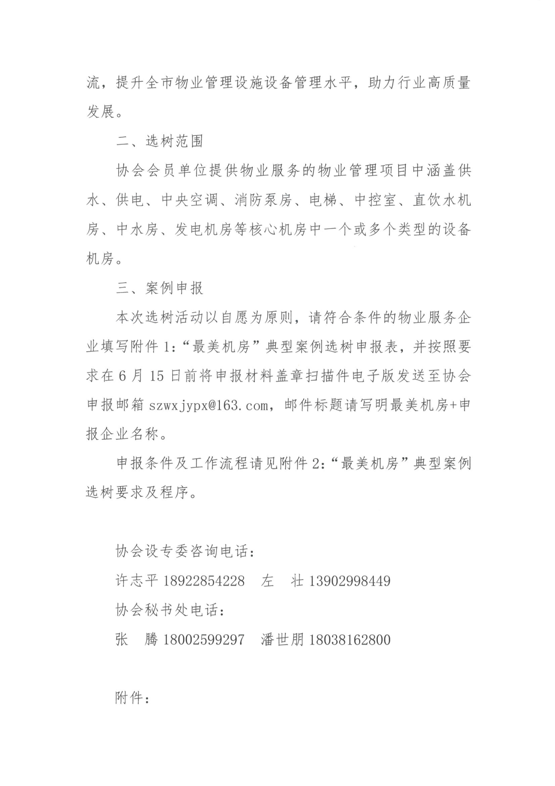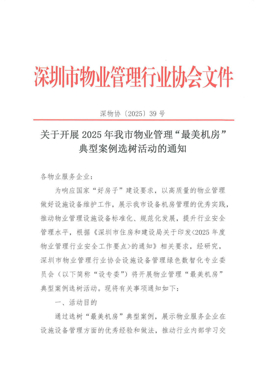 为响应国家“好房子”建设要求,以高质量的物业管理做好设施设备维护工作,展示我市设备机房管理的优秀实践,推动物业管理设施设备标准化、规范化发展,提升行业安全管理水平,根据《深圳市住房和建设局关于印发<2025年度物业管理行业安全工作要点>的通知》相关要求,经研究,深圳市物业管理行业协会设施设备管理绿色数智化专业委员会(以下简称“设专委”)将开展物业管理“最美机房”典型案例选树活动。现将有关事项通知如下: 通过选树“最美机房”典型案例,展示物业服务企业在设施设备管理方面的优秀经验和做法,推动行业内部学习交流,提升全市物业管理设施设备管理水平,助力行业高质量发展。 协会会员单位提供物业服务的物业管理项目中涵盖供水、供电、中央空调、消防泵房、电梯、中控室、直饮水机房、中水房、发电机房等核心机房中一个或多个类型的设备机房。 本次选树活动以自愿为原则,请符合条件的物业服务企业填写附件1:“最美机房”典型案例选树申报表,并按照要求在6月15日前将申报材料盖章扫描件电子版发送至协会申报邮箱szwxjypx@163.com,邮件标题请写明最美机房+申报企业名称。 申报条件及工作流程请见附件2:“最美机房”典型案例选树要求及程序。 许志平18922854228 左 壮13902998449 张 腾18002599297 潘世朋18038162800通知原文如下: