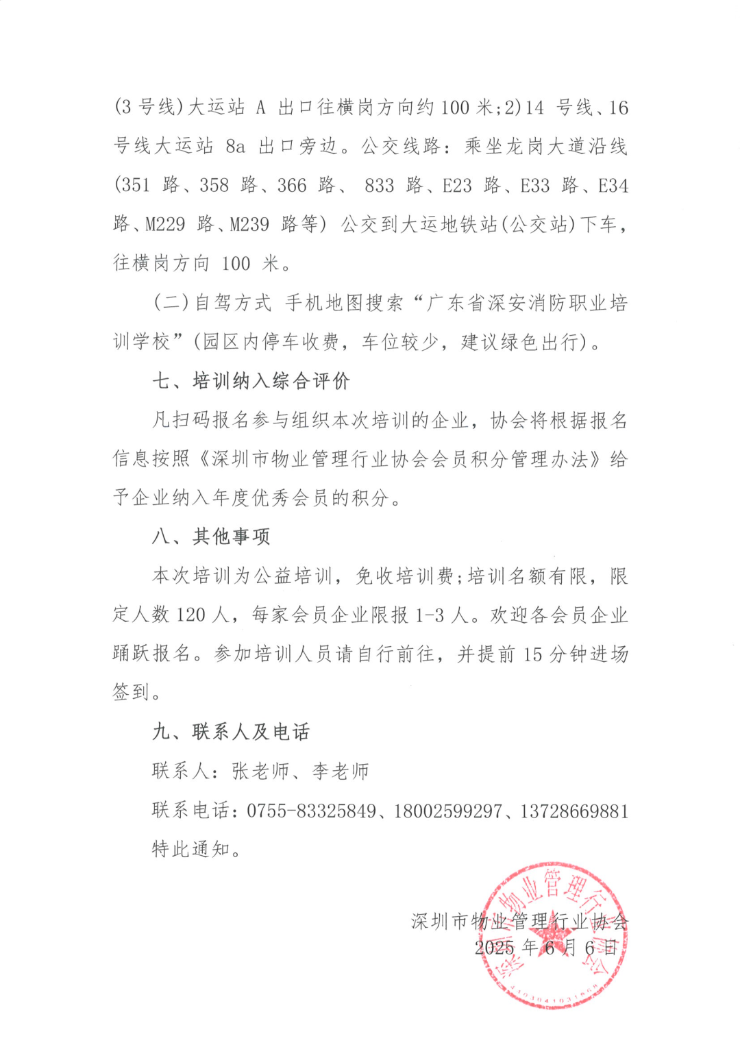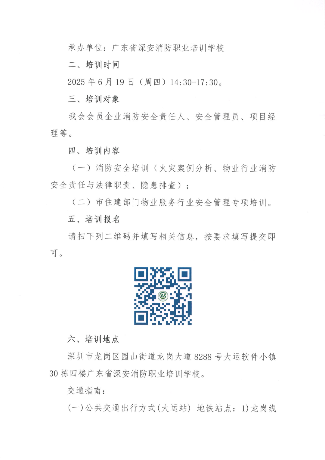 公交到大运地铁站(公交站)下车,往横岗方向 100 米。 (二)自驾方式 手机地图搜索“广东省深安消防职业培训学校”(园区内停车收费,车位较少,建议绿色出行)。 凡扫码报名参与组织本次培训的企业,协会将根据报名信息按照《深圳市物业管理行业协会会员积分管理办法》给予企业纳入年度优秀会员的积分。 本次培训为公益培训,免收培训费;培训名额有限,限定人数120人,每家会员企业限报1-3人。欢迎各会员企业踊跃报名。参加培训人员请自行前往,并提前15分钟进场签到。 联系电话:0755-83325849、18002599297、13728669881通知原文如下:
