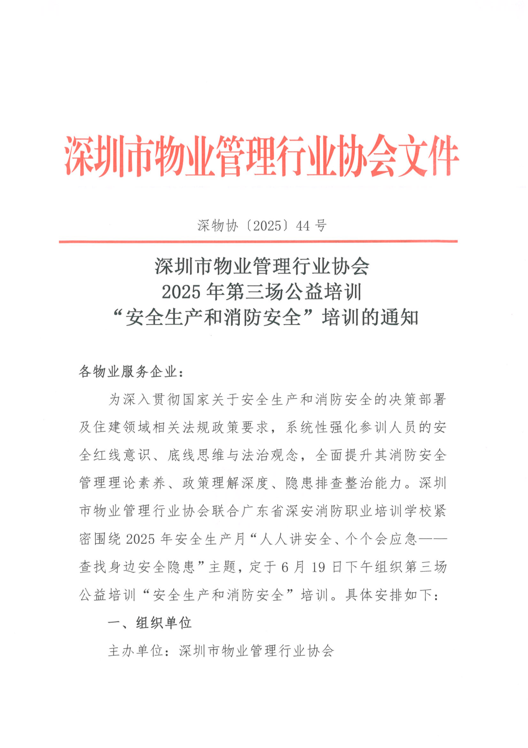 为深入贯彻国家关于安全生产和消防安全的决策部署及住建领域相关法规政策要求,系统性强化参训人员的安全红线意识、底线思维与法治观念,全面提升其消防安全管理理论素养、政策理解深度、隐患排查整治能力。深圳市物业管理行业协会联合广东省深安消防职业培训学校紧密围绕2025年安全生产月“人人讲安全、个个会应急——查找身边安全隐患”主题,定于6月19日下午组织第三场公益培训“安全生产和消防安全”培训。具体安排如下: 2025年6月19日(周四)14:30-17:30。 我会会员企业消防安全责任人、安全管理员、项目经理等。 (一)消防安全培训(火灾案例分析、物业行业消防安全责任与法律职责、隐患排查); 请扫下列二维码并填写相关信息,按要求填写提交即可。