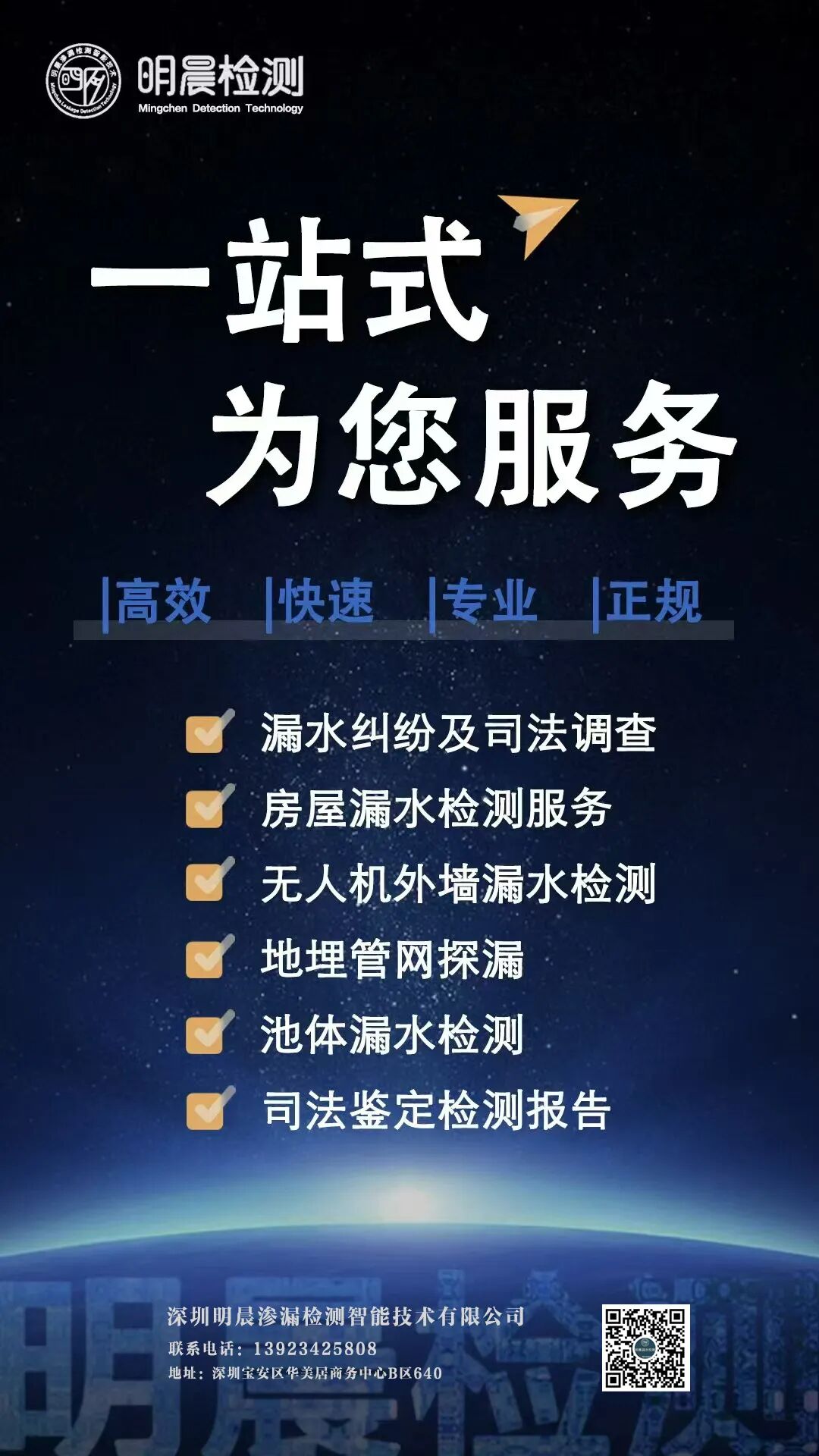 深圳明晨渗漏检测智能技术有限公司(以下简称“明晨检测”)成立于2019年,是国内获得漏水检测专项资质认定的第三方检测机构,也是国家高新技术企业。公司专注建筑及管道渗漏检测领域,业务覆盖漏水司法鉴定、民用及公建室内外渗漏检测、排放不合格企业渗漏检测三大核心方向,致力于通过技术创新解决行业痛点,为物业企业提供高效、精准的技术支持。