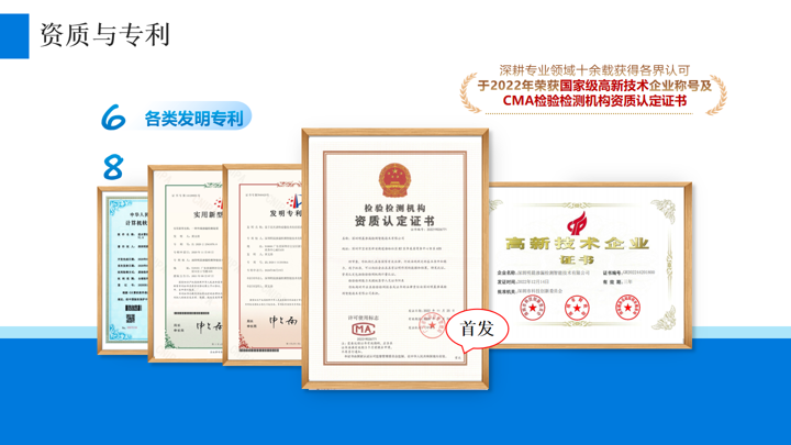 承担“十三五”国家科技重大专项课题,技术实力获国家认可;全国210个城市设立分支机构,构建“半小时响应”服务网络;团队规模超500人,含4名高级职称专家、67名中级职称技术人员及478名持证检测师;累计投入超千万元研发检测设备,获66项专利,主导编制深圳团体标准,与东南大学、南京工业大学共建产学研平台。