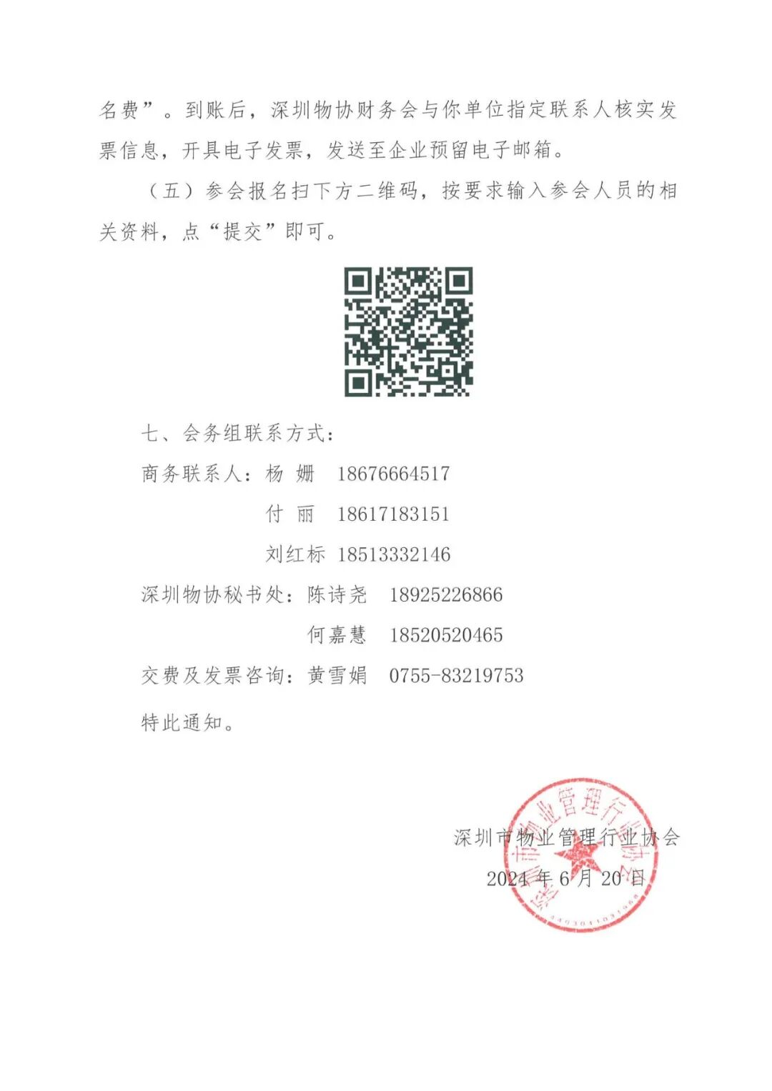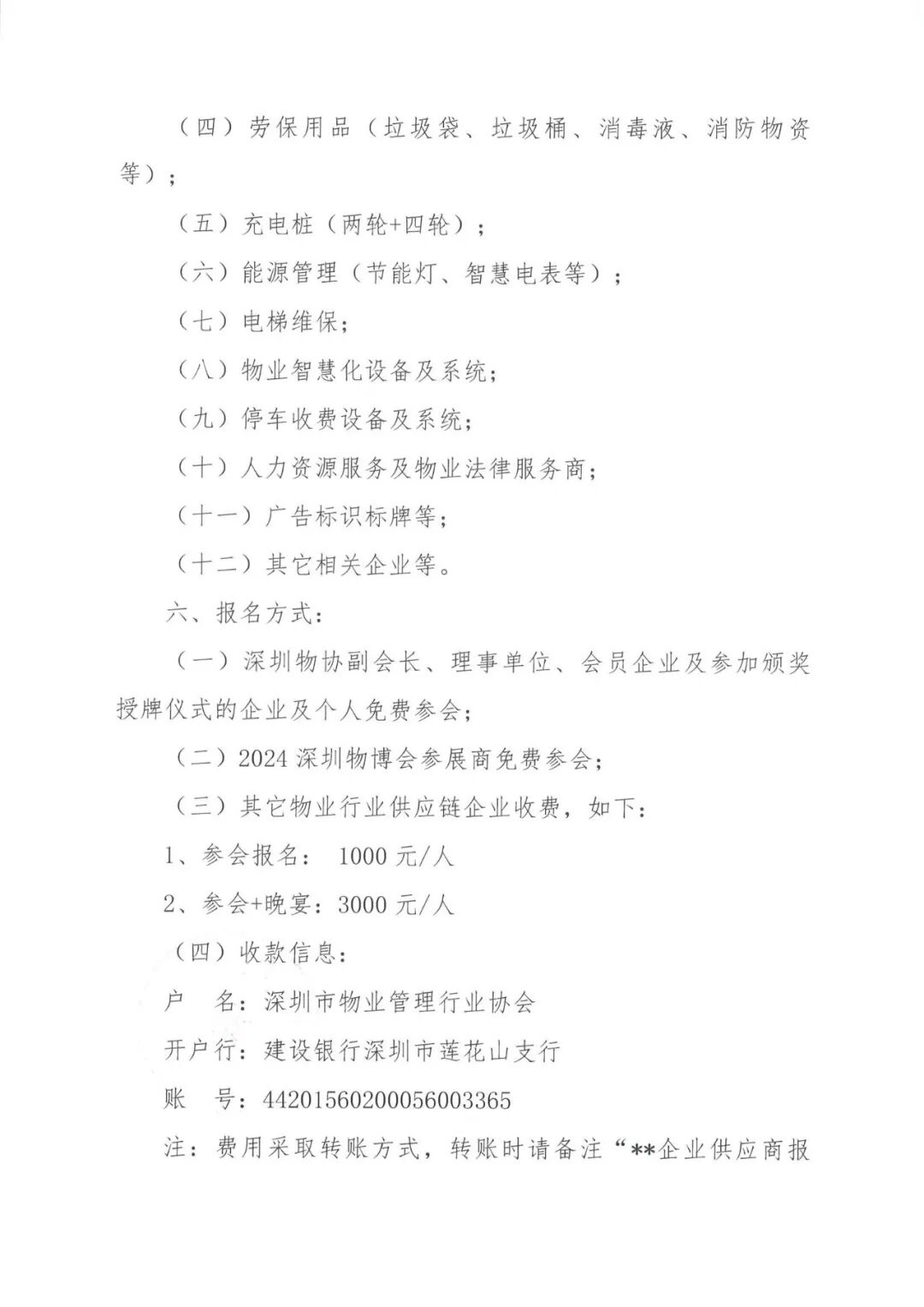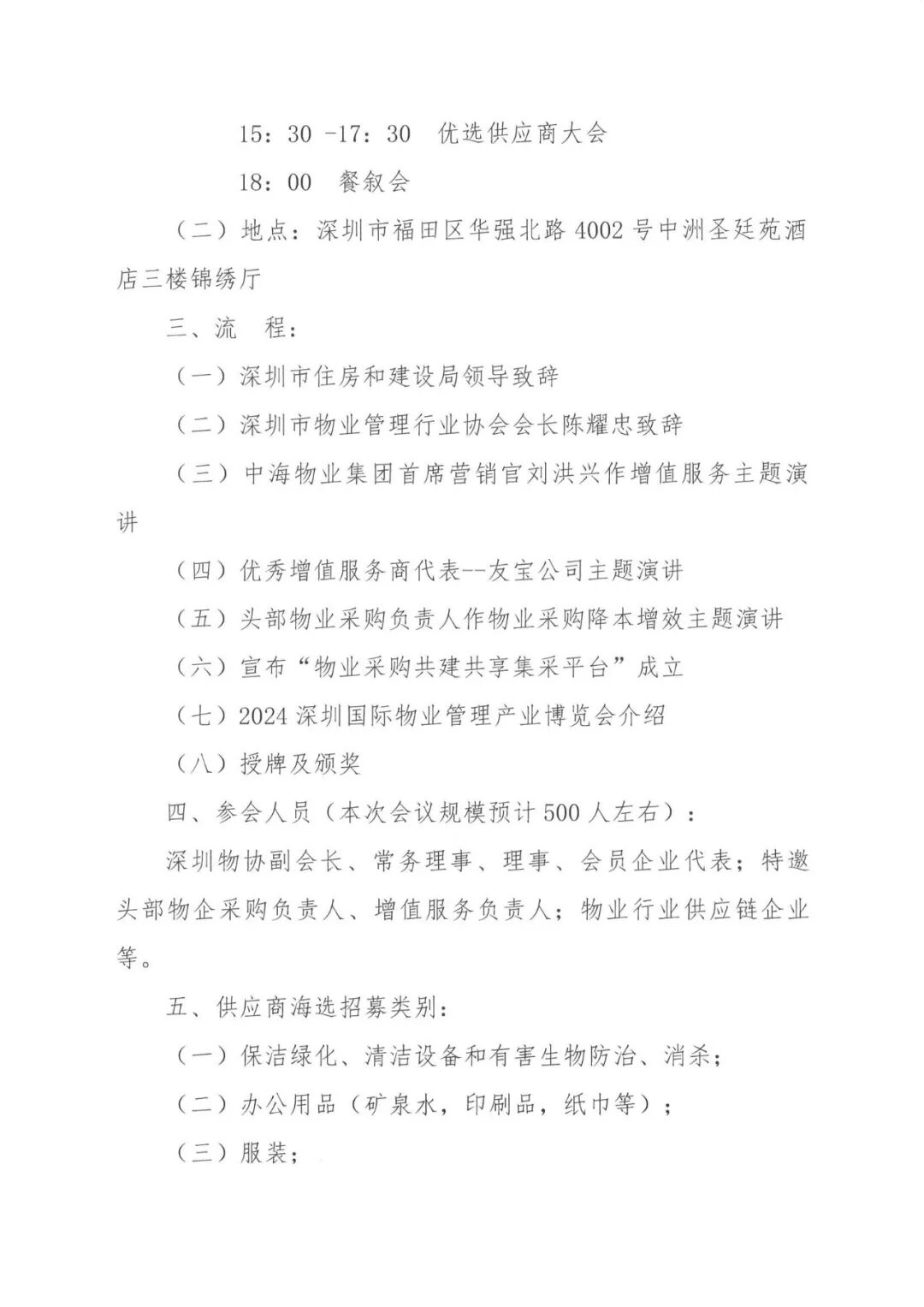 2024深圳国际物业管理产业博览会定于10月15~17日在深圳会展中心8、9号馆(福田)举办。本届物博会已升级定位成“展、采、会”无缝链接的交易模式,主打“物业管理+”概念,将会成为一个由物业企业充当“买手”的招采平台。为吸引更多优质物业供应链企业参加本次物博会,为物业行业采购降本增效赋能,深圳物协联合全国10家头部物企成立行业首家物业管理采购“共建共享集采平台”,并共同发起“2024物业管理优质供应商海选招募大会”。 发起单位:万物云、碧桂园服务、绿城服务、招商积余、金碧物业、长城物业、金科物业、华润万象生活、中海物业、融创物业等。 (二)地点:深圳市福田区华强北路4002号中洲圣廷苑酒店三楼锦绣厅 (三)中海物业集团首席营销官刘洪兴作增值服务主题演讲 (五)头部物业采购负责人作物业采购降本增效主题演讲 深圳物协副会长、常务理事、理事、会员企业代表;特邀头部物企采购负责人、增值服务负责人;物业行业供应链企业等。 (四)劳保用品(垃圾袋、垃圾桶、消毒液、消防物资等); (一)深圳物协副会长、理事单位、会员企业及参加颁奖授牌仪式的企业及个人免费参会; 注:费用采取转账方式,转账时请备注“**企业供应商报名费”。到账后,深圳物协财务会与你单位指定联系人核实发票信息,开具电子发票,发送至企业预留电子邮箱。 (五)参会报名扫下方二维码,按要求输入参会人员的相关资料,点“提交”即可。