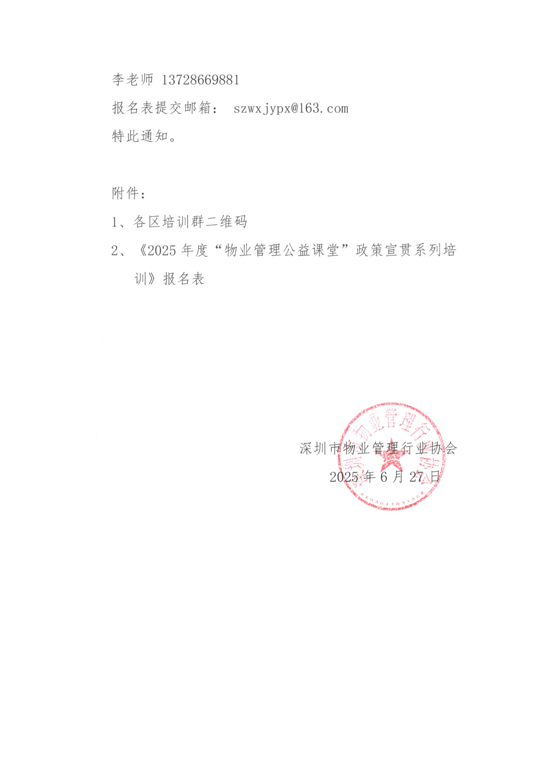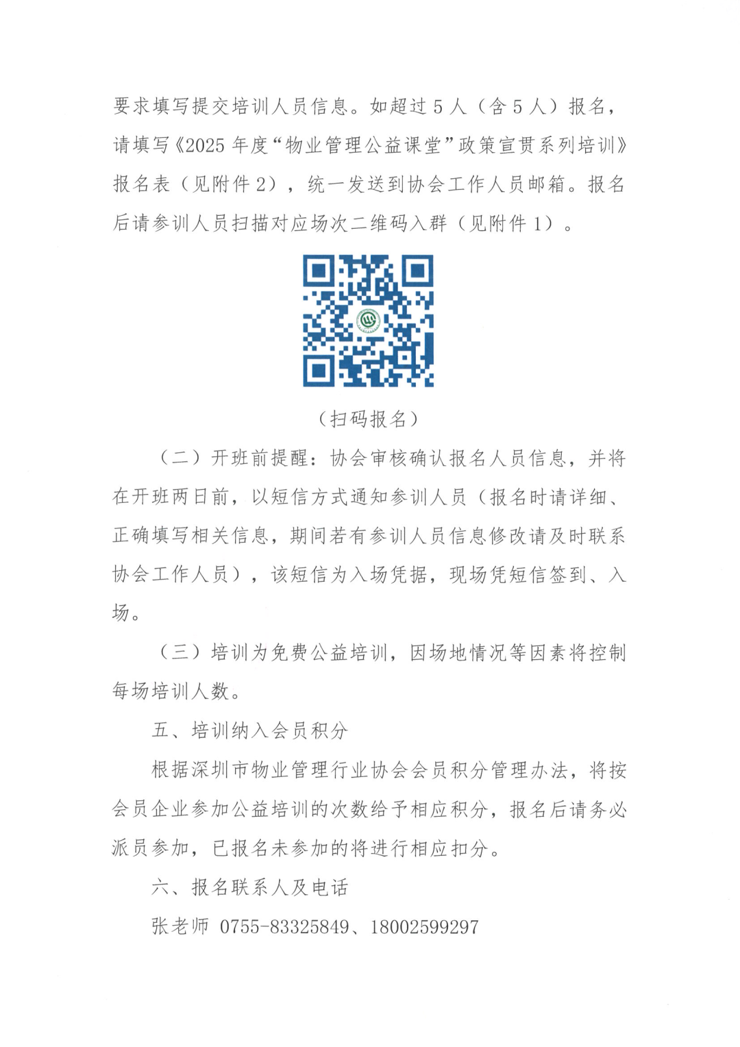 (二)开班前提醒:协会审核确认报名人员信息,并将在开班两日前,以短信方式通知参训人员(报名时请详细、正确填写相关信息,期间若有参训人员信息修改请及时联系协会工作人员),该短信为入场凭据,现场凭短信签到、入场。 (三)培训为免费公益培训,因场地情况等因素将控制每场培训人数。 根据深圳市物业管理行业协会会员积分管理办法,将按会员企业参加公益培训的次数给予相应积分,报名后请务必派员参加,已报名未参加的将进行相应扣分。 张老师 0755-83325849、18002599297 2、《2025年度“物业管理公益课堂”政策宣贯系列培训》报名表通知原文如下: