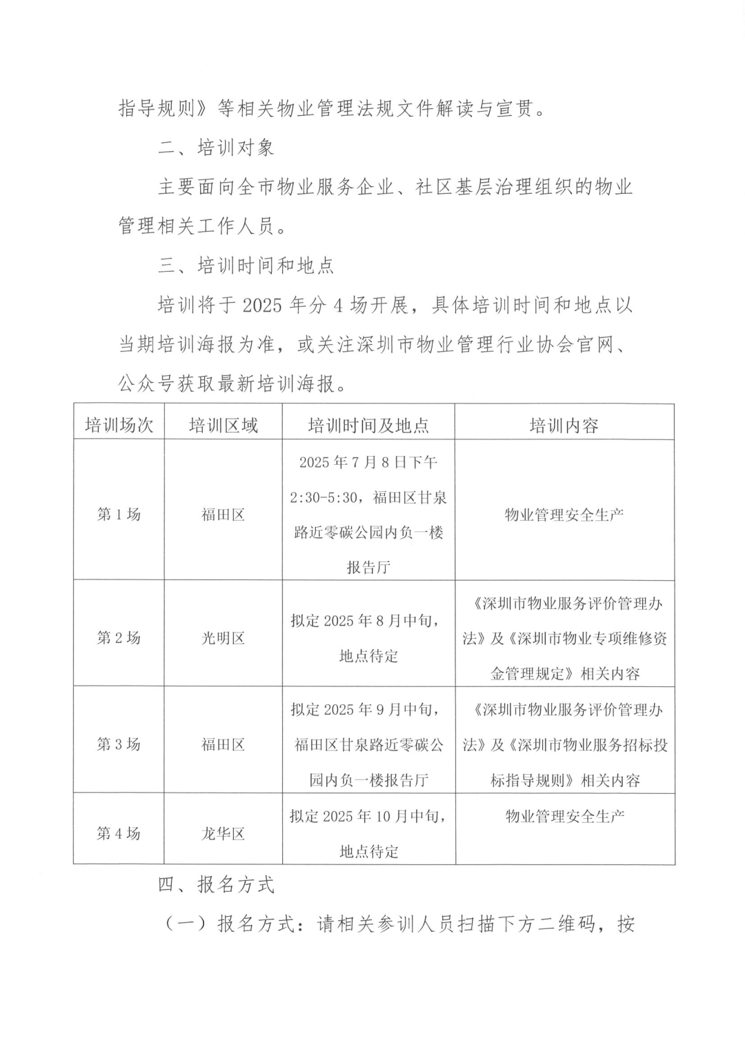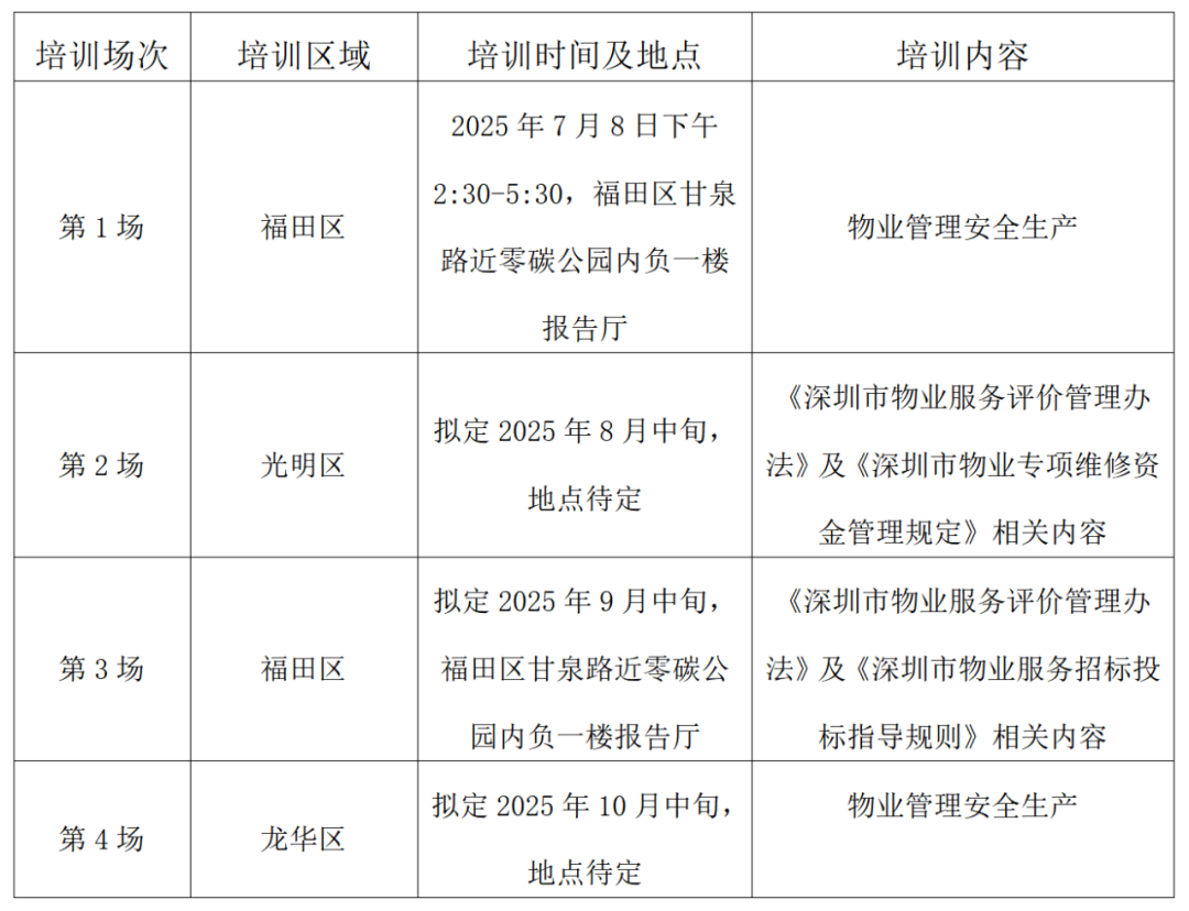 为进一步提升全市物业服务企业安全与应急管理服务能力,规范物业专项维修资金管理与物业服务招标投标活动,营造诚实守信的物业服务市场环境,我会受深圳市物业管理服务促进中心(深圳市物业专项维修资金管理中心)委托,拟在全市范围内组织开展“物业管理公益课堂”政策宣贯系列培训。具体培训安排如下: 物业管理安全生产、《物业服务安全与应急管理导则》、《物业服务行业安全管理检查评价规范》、《深圳市物业专项维修资金管理规定》、《深圳市业主组织指导规则》、《深圳市物业服务评价管理办法》、《深圳市物业服务招标投标指导规则》等相关物业管理法规文件解读与宣贯。 主要面向全市物业服务企业、社区基层治理组织的物业管理相关工作人员。 培训将于2025年分4场开展,具体培训时间和地点以当期培训海报为准,或关注深圳市物业管理行业协会官网、公众号获取最新培训海报。