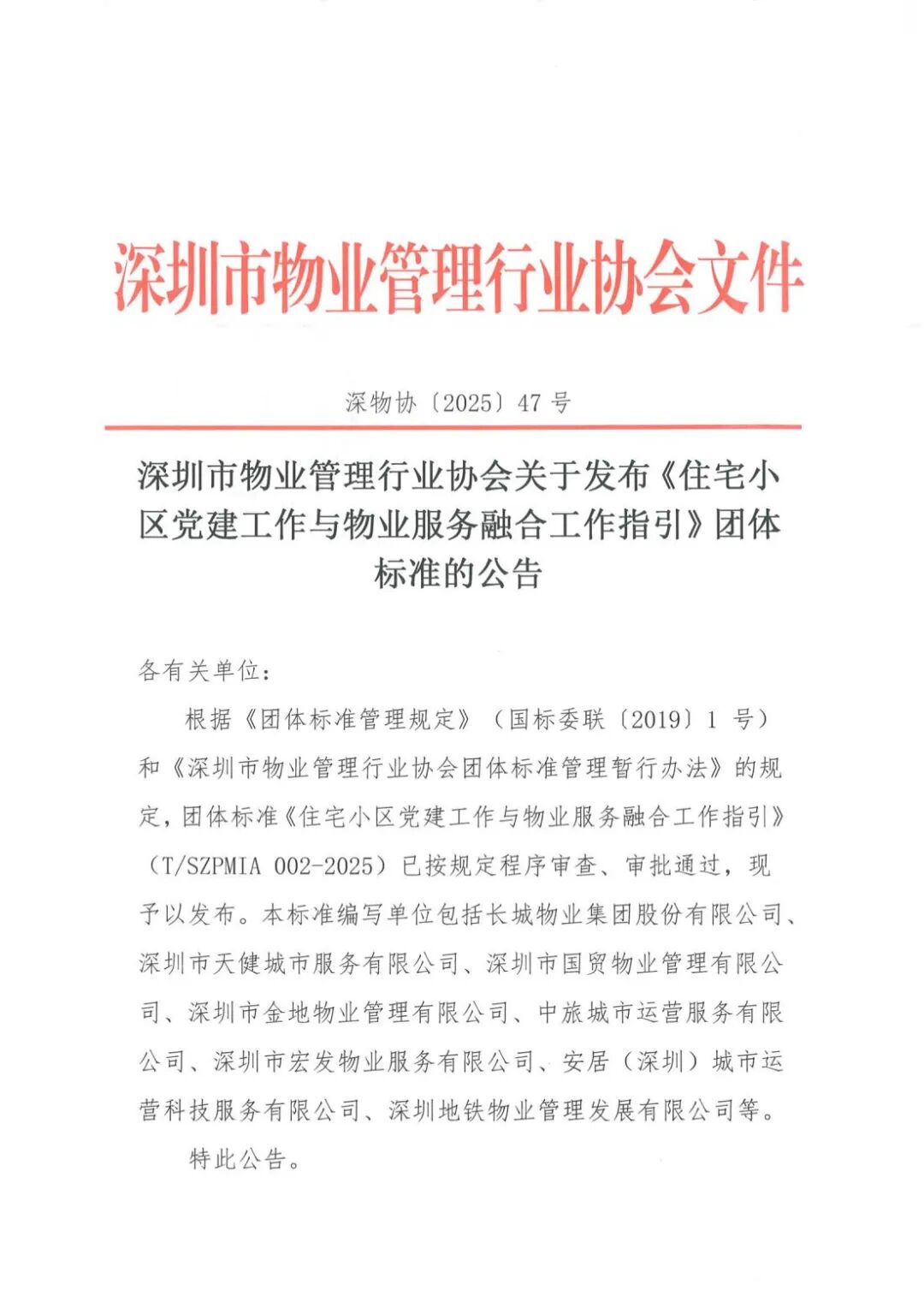 002-2025)已按规定程序审查、审批通过,现予以发布。本标准编写单位包括长城物业集团股份有限公司、深圳市天健城市服务有限公司、深圳市国贸物业管理有限公司、深圳市金地物业管理有限公司、中旅城市运营服务有限公司、深圳市宏发物业服务有限公司、安居(深圳)城市运营科技服务有限公司、深圳地铁物业管理发展有限公司等。通知原文如下: