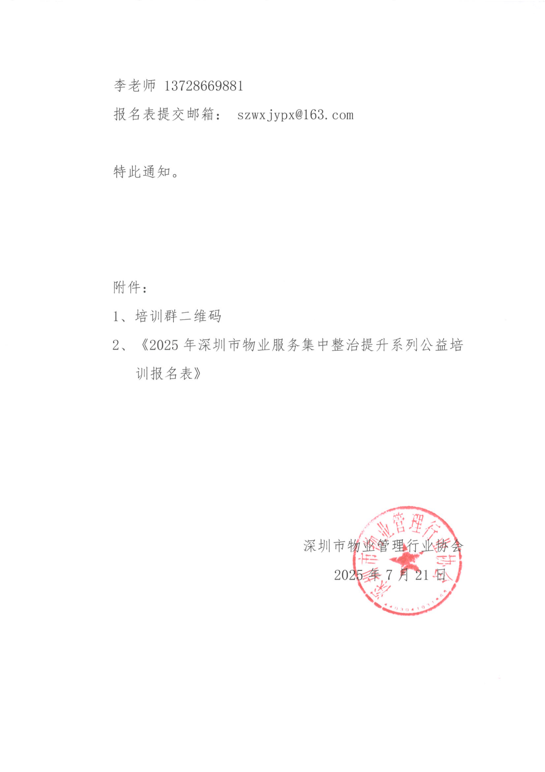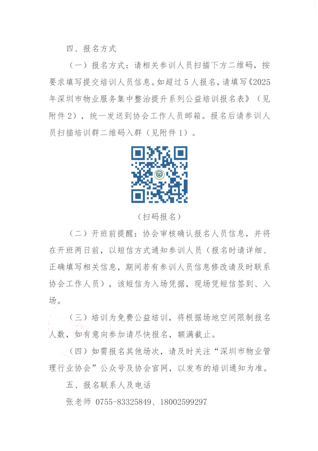 (二)开班前提醒:协会审核确认报名人员信息,并将在开班两日前,以短信方式通知参训人员(报名时请详细、正确填写相关信息,期间若有参训人员信息修改请及时联系协会工作人员),该短信为入场凭据,现场凭短信签到、入场。 (三)培训为免费公益培训,将根据场地空间限制报名人数,如有意向参加请尽快报名,额满截止。 (四)如需报名其他场次,请及时关注“深圳市物业管理行业协会”公众号及协会官网,以发布的培训通知为准。 张老师 0755-83325849、18002599297 2、《2025年深圳市物业服务集中整治提升系列公益培训报名表》通知原文如下: