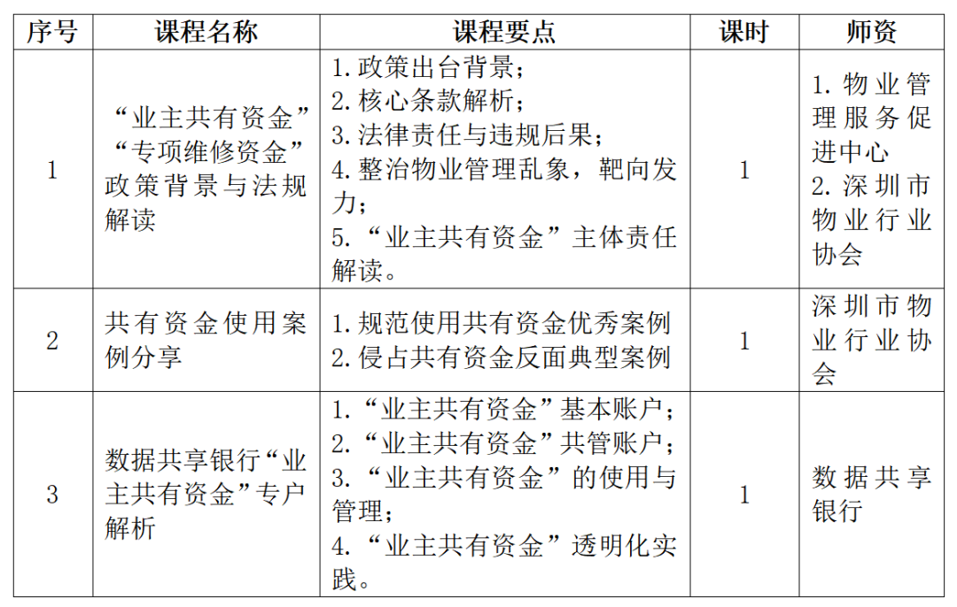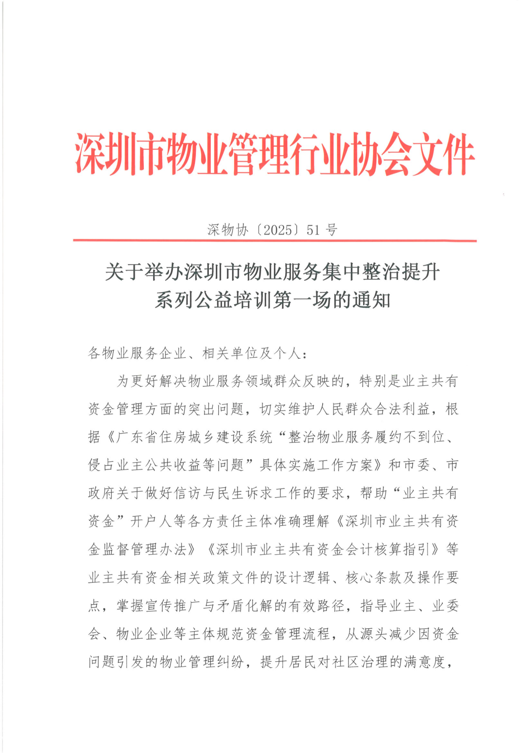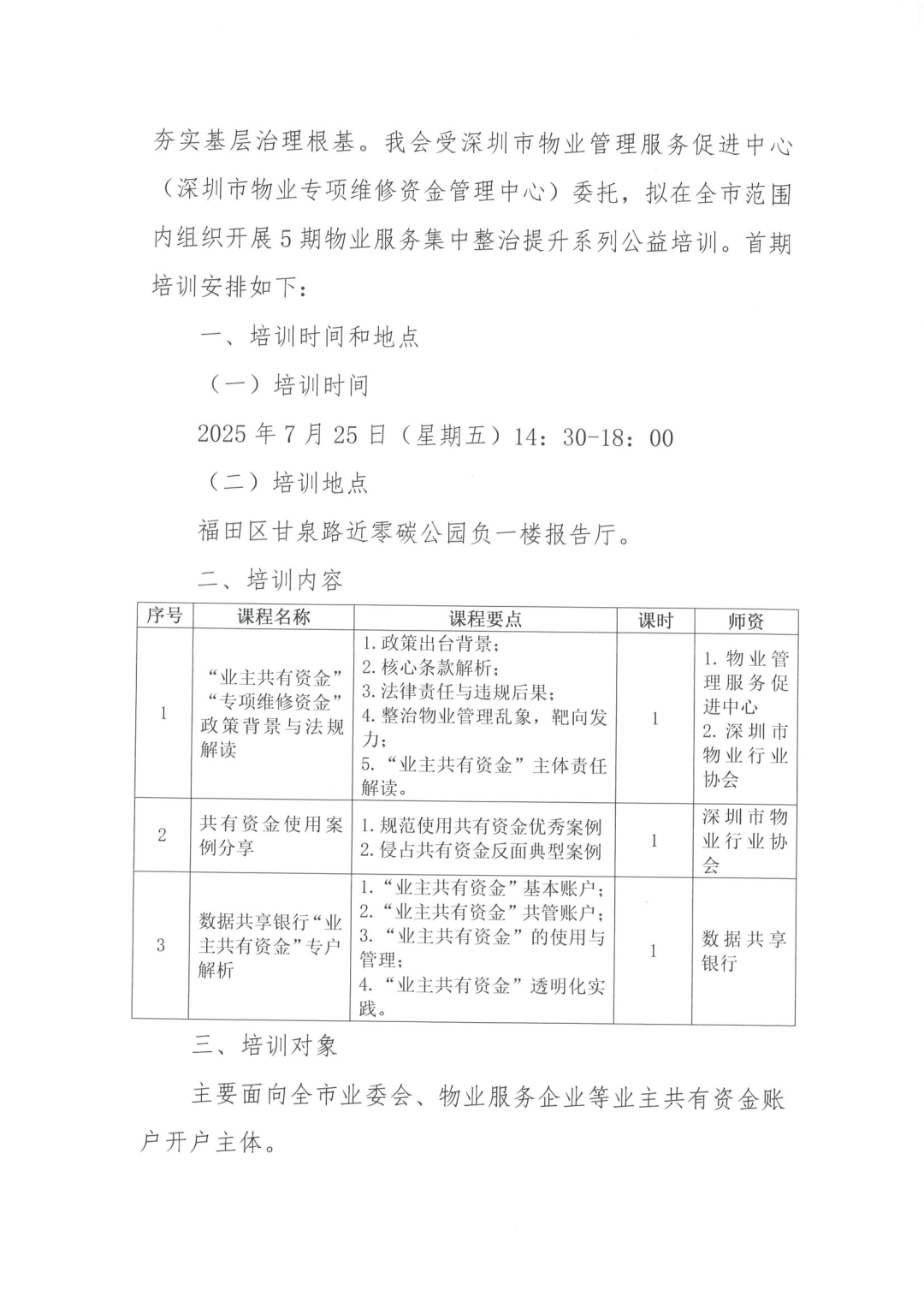 为更好解决物业服务领域群众反映的,特别是业主共有资金管理方面的突出问题,切实维护人民群众合法利益,根据《广东省住房城乡建设系统“整治物业服务履约不到位、侵占业主公共收益等问题”具体实施工作方案》和市委、市政府关于做好信访与民生诉求工作的要求,帮助“业主共有资金”开户人等各方责任主体准确理解《深圳市业主共有资金监督管理办法》《深圳市业主共有资金会计核算指引》等业主共有资金相关政策文件的设计逻辑、核心条款及操作要点,掌握宣传推广与矛盾化解的有效路径,指导业主、业委会、物业企业等主体规范资金管理流程,从源头减少因资金问题引发的物业管理纠纷,提升居民对社区治理的满意度,夯实基层治理根基。我会受深圳市物业管理服务促进中心(深圳市物业专项维修资金管理中心)委托,拟在全市范围内组织开展5期物业服务集中整治提升系列公益培训。首期培训安排如下: 2025年7月25日(星期五)14:30-18:00