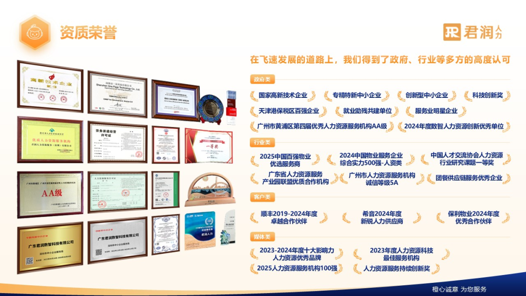 君润人力是一家以科技驱动的综合人力资源解决方案服务商,依托行业领先的科技水平和服务能力,专注于为服务业提供一站式人力资源服务,助力其人力资源管理效能提升,同时提高劳动者幸福指数,促进社会就业。君润人力总部位于广东省深圳市,服务覆盖全国350+城市,客户服务团队1500+,具备提供网络型人力资源服务的落地能力。在飞速发展的道路上,我们得到了政府、行业等多方的高度认可与信赖。