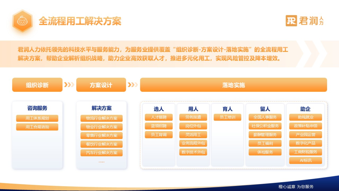 基于对服务业细分场景业务模式的深入洞察,结合“招聘+岗位外包+灵活用工+流程外包+HRSaaS”等多款产品,君润人力为物流、物业、零售、餐饮等行业量身定制人力资源服务综合解决方案。