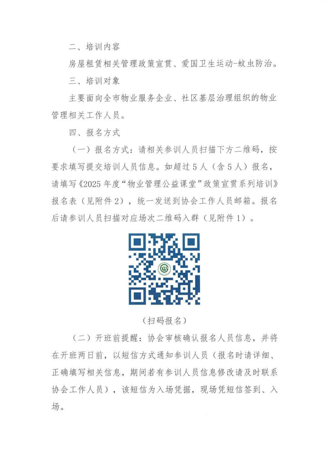 为进一步提升全市物业服务企业安全与应急管理服务能力,规范物业专项维修资金管理与物业服务招标投标活动,营造诚实守信的物业服务市场环境,我会受深圳市物业管理服务促进中心(深圳市物业专项维修资金管理中心)委托,拟在全市范围内组织开展4期“物业管理公益课堂”政策宣贯系列培训。第二场培训安排如下: 2025年8月25日(星期一)14:30-18:00 房屋租赁相关管理政策宣贯、爱国卫生运动-蚊虫防治。 主要面向全市物业服务企业、社区基层治理组织的物业管理相关工作人员。 (一)报名方式:请相关参训人员扫描下方二维码,按要求填写提交培训人员信息。如超过5人(含5人)报名,请填写《2025年度“物业管理公益课堂”政策宣贯系列培训》报名表(见附件2),统一发送到协会工作人员邮箱。报名后请参训人员扫描对应场次二维码入群(见附件1)。