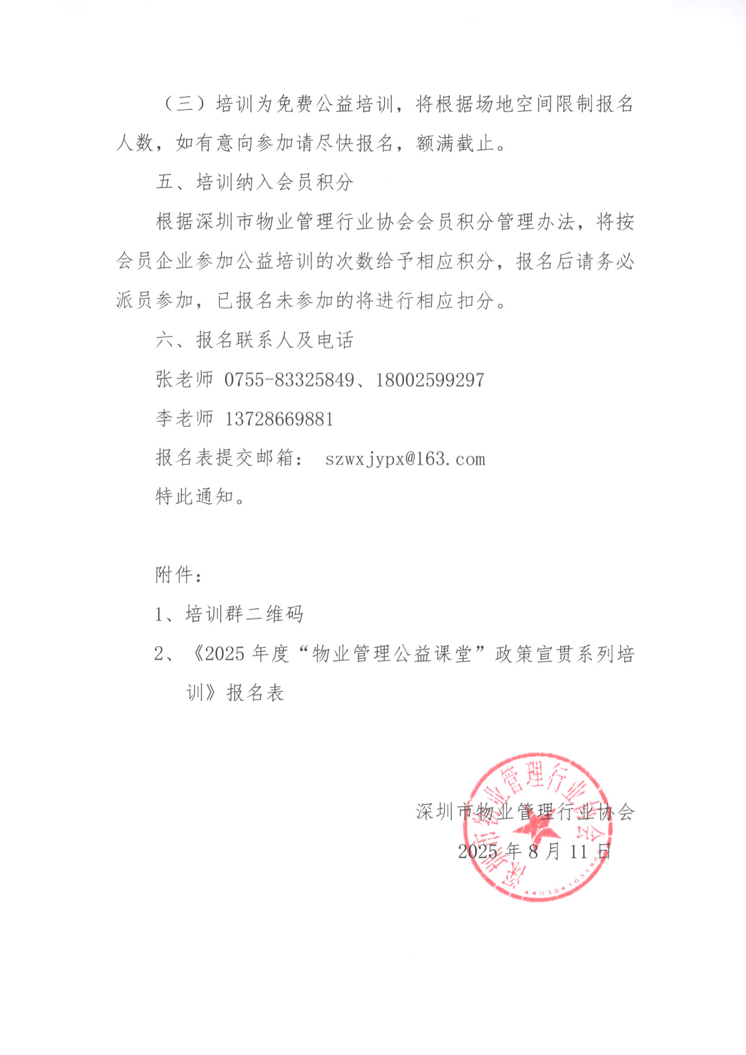 (二)开班前提醒:协会审核确认报名人员信息,并将在开班两日前,以短信方式通知参训人员(报名时请详细、正确填写相关信息,期间若有参训人员信息修改请及时联系协会工作人员),该短信为入场凭据,现场凭短信签到、入场。 (三)培训为免费公益培训,将根据场地空间限制报名人数,如有意向参加请尽快报名,额满截止。 根据深圳市物业管理行业协会会员积分管理办法,将按会员企业参加公益培训的次数给予相应积分,报名后请务必派员参加,已报名未参加的将进行相应扣分。 张老师 0755-83325849、18002599297 2、《2025年度“物业管理公益课堂”政策宣贯系列培训》报名表通知原文如下: