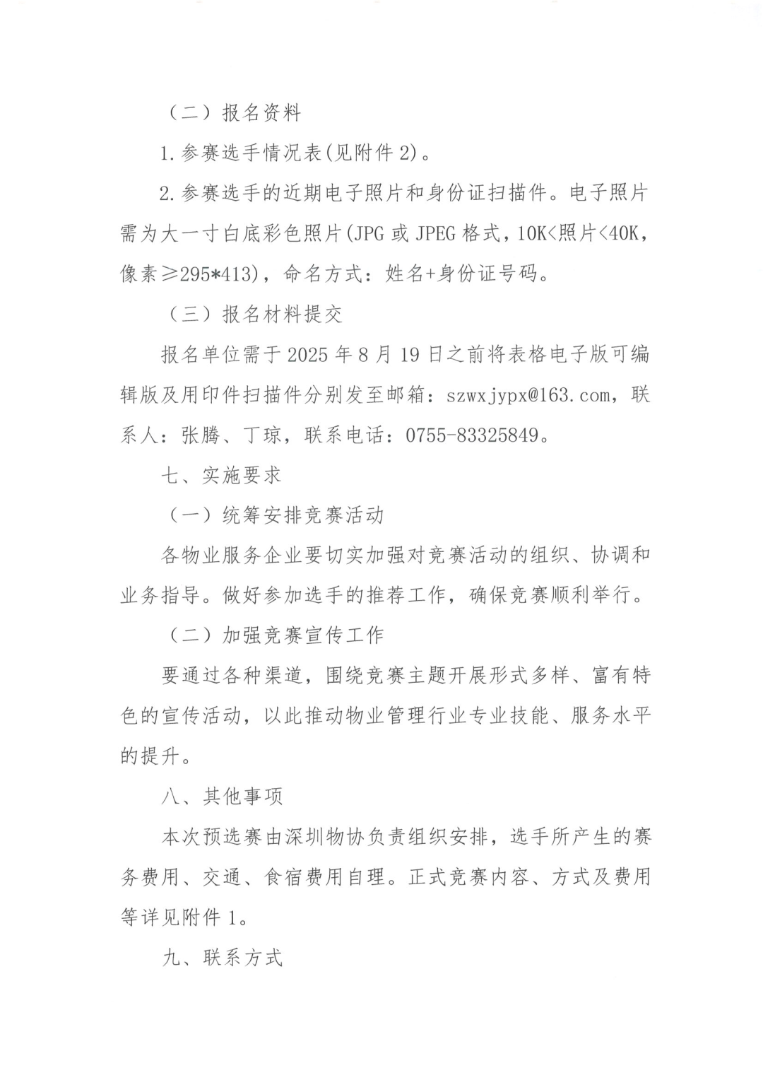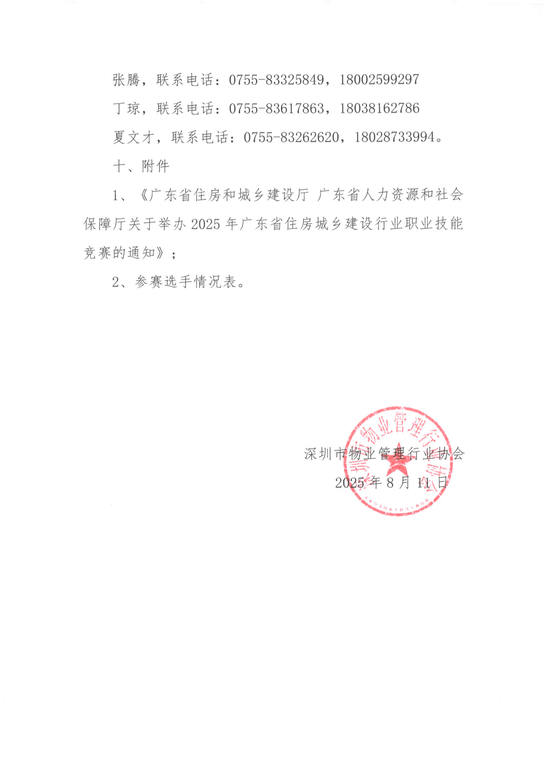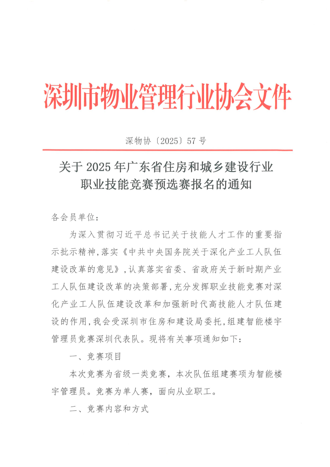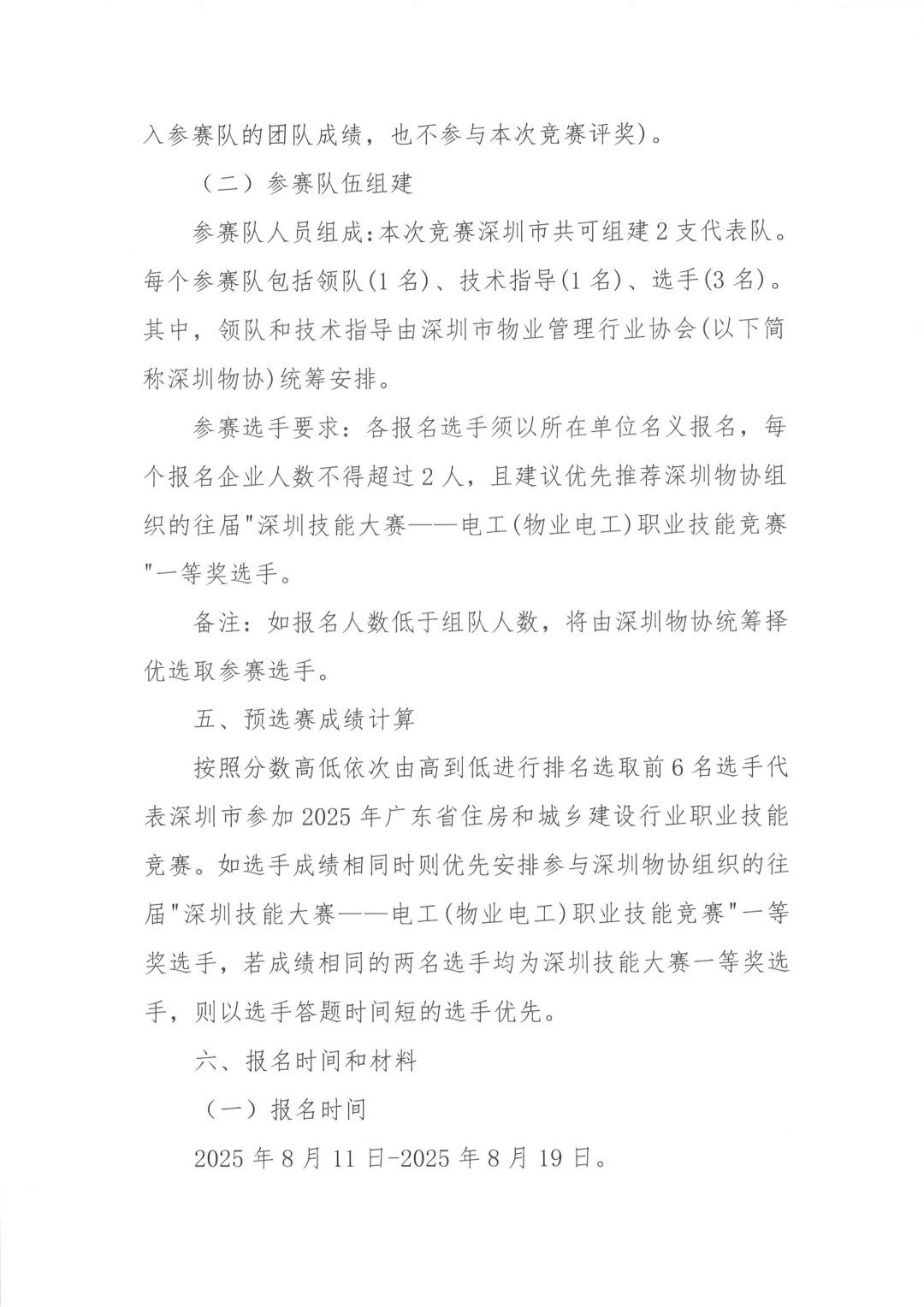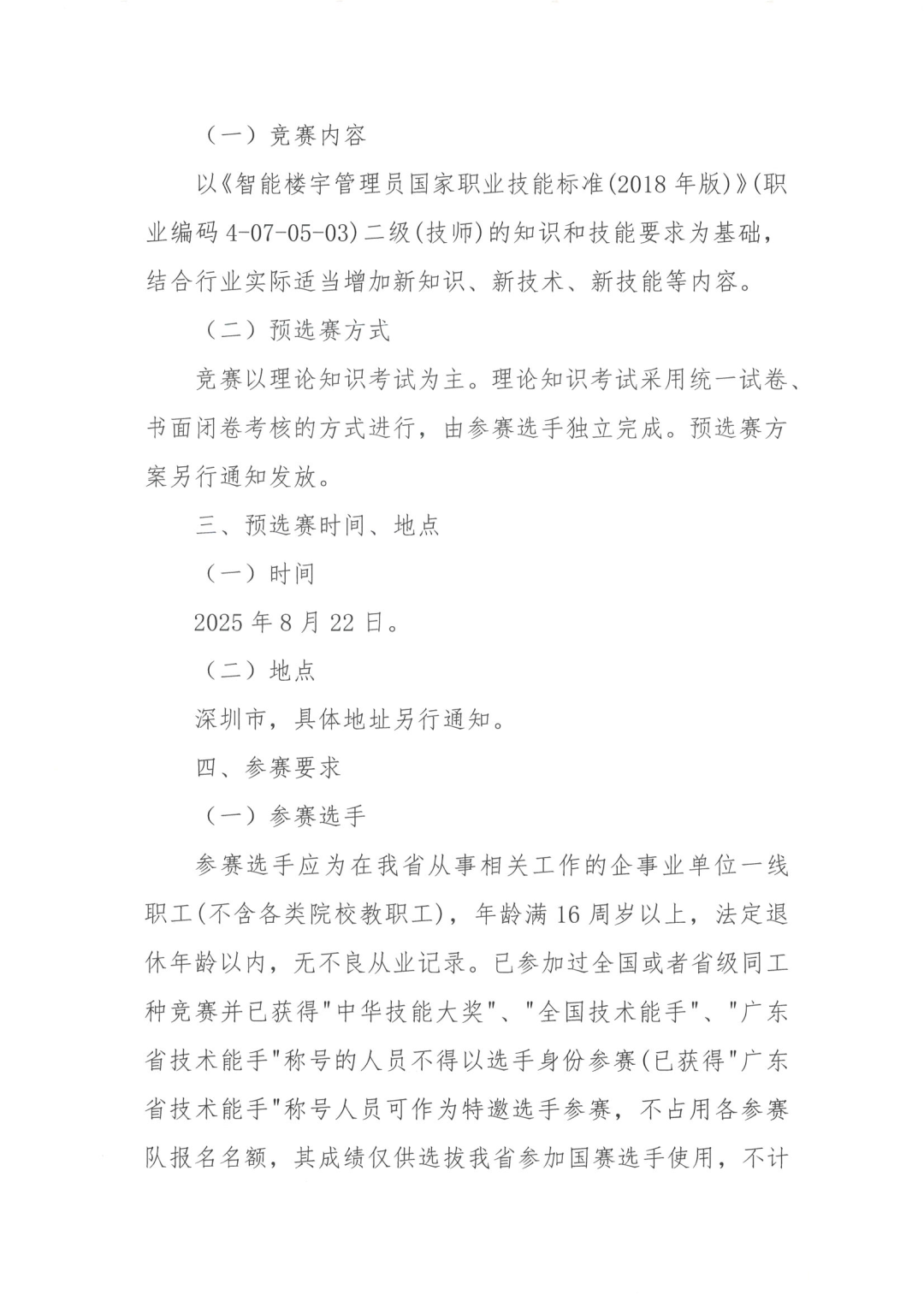 为深入贯彻习近平总书记关于技能人才工作的重要指示批示精神,落实《中共中央国务院关于深化产业工人队伍建设改革的意见》,认真落实省委、省政府关于新时期产业工人队伍建设改革的决策部署,充分发挥职业技能竞赛对深化产业工人队伍建设改革和加强新时代高技能人才队伍建设的作用,我会受深圳市住房和建设局委托,组建智能楼宇管理员竞赛深圳代表队。现将有关事项通知如下: 本次竞赛为省级一类竞赛,本次队伍组建赛项为智能楼宇管理员。竞赛为单人赛,面向从业职工。 以《智能楼宇管理员国家职业技能标准(2018年版)》(职业编码4-07-05-03)二级(技师)的知识和技能要求为基础,结合行业实际适当增加新知识、新技术、新技能等内容。 竞赛以理论知识考试为主。理论知识考试采用统一试卷、书面闭卷考核的方式进行,由参赛选手独立完成。预选赛方案另行通知发放。 参赛选手应为在我省从事相关工作的企事业单位一线职工(不含各类院校教职工),年龄满16周岁以上,法定退休年龄以内,无不良从业记录。已参加过全国或者省级同工种竞赛并已获得"中华技能大奖"、"全国技术能手"、"广东省技术能手"称号的人员不得以选手身份参赛(已获得"广东省技术能手"称号人员可作为特邀选手参赛,不占用各参赛队报名名额,其成绩仅供选拔我省参加国赛选手使用,不计入参赛队的团队成绩,也不参与本次竞赛评奖)。 参赛队人员组成:本次竞赛深圳市共可组建2支代表队。每个参赛队包括领队(1名)、技术指导(1名)、选手(3名)。其中,领队和技术指导由深圳市物业管理行业协会(以下简称深圳物协)统筹安排。 参赛选手要求:各报名选手须以所在单位名义报名,每个报名企业人数不得超过2人,且建议优先推荐深圳物协组织的往届"深圳技能大赛——电工(物业电工)职业技能竞赛"一等奖选手。 备注:如报名人数低于组队人数,将由深圳物协统筹择优选取参赛选手。 按照分数高低依次由高到低进行排名选取前6名选手代表深圳市参加2025年广东省住房和城乡建设行业职业技能竞赛。如选手成绩相同时则优先安排参与深圳物协组织的往届"深圳技能大赛——电工(物业电工)职业技能竞赛"一等奖选手,若成绩相同的两名选手均为深圳技能大赛一等奖选手,则以选手答题时间短的选手优先。 2.参赛选手的近期电子照片和身份证扫描件。电子照片需为大一寸白底彩色照片(JPG或JPEG格式,10K<照片<40K,像素≥295*413),命名方式:姓名+身份证号码。 报名单位需于2025年8月19日之前将表格电子版可编辑版及用印件扫描件分别发至邮箱:szwxjypx@163.com,联系人:张腾、丁琼,联系电话:0755-83325849。 各物业服务企业要切实加强对竞赛活动的组织、协调和业务指导。做好参加选手的推荐工作,确保竞赛顺利举行。 要通过各种渠道,围绕竞赛主题开展形式多样、富有特色的宣传活动,以此推动物业管理行业专业技能、服务水平的提升。 本次预选赛由深圳物协负责组织安排,选手所产生的赛务费用、交通、食宿费用自理。正式竞赛内容、方式及费用等详见附件1。 张腾,联系电话:0755-83325849,18002599297 丁琼,联系电话:0755-83617863,18038162786 夏文才,联系电话:0755-83262620,18028733994。 1、《广东省住房和城乡建设厅 广东省人力资源和社会保障厅关于举办2025年广东省住房城乡建设行业职业技能竞赛的通知》;通知原文如下: