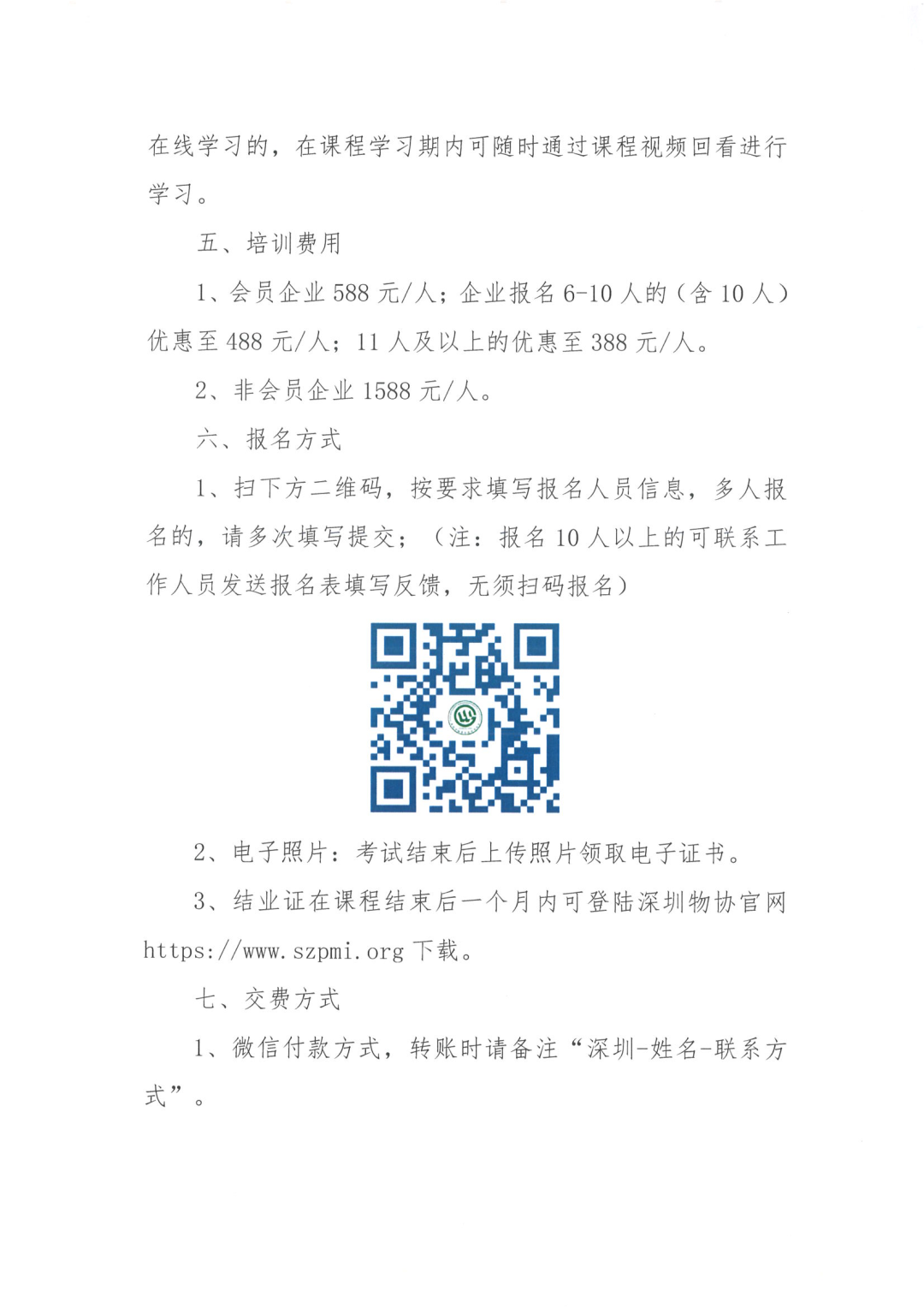 3、结业证在课程结束后一个月内可登陆深圳物协官网https://www.szpmi.org下载。 1、微信付款方式,转账时请备注“深圳-姓名-联系方式”。