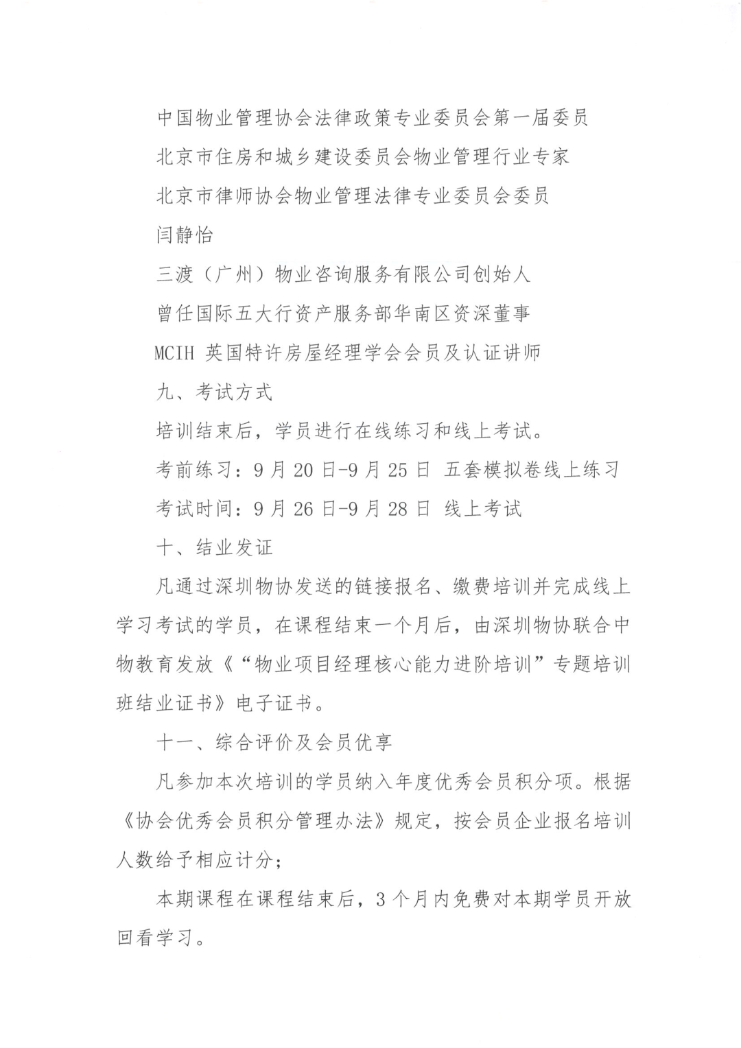 3、9月5日截止报名及缴费,报名时请详细、正确填写培训人员信息,交费时请备注“XX企业专题班报名”。 到账后,财务人员将在开班后五个工作日内与你单位指定联系人核实发票信息,开具电子发票,发送至企业预留电子邮箱,请注意查收。 考前练习:9月20日-9月25日 五套模拟卷线上练习 凡通过深圳物协发送的链接报名、缴费培训并完成线上学习考试的学员,在课程结束一个月后,由深圳物协联合中物教育发放《“物业项目经理核心能力进阶培训”专题培训班结业证书》电子证书。 凡参加本次培训的学员纳入年度优秀会员积分项。根据《协会优秀会员积分管理办法》规定,按会员企业报名培训人数给予相应计分; 本期课程在课程结束后,3个月内免费对本期学员开放回看学习。 张老师 0755-83325849、18002599297通知原文如下:
