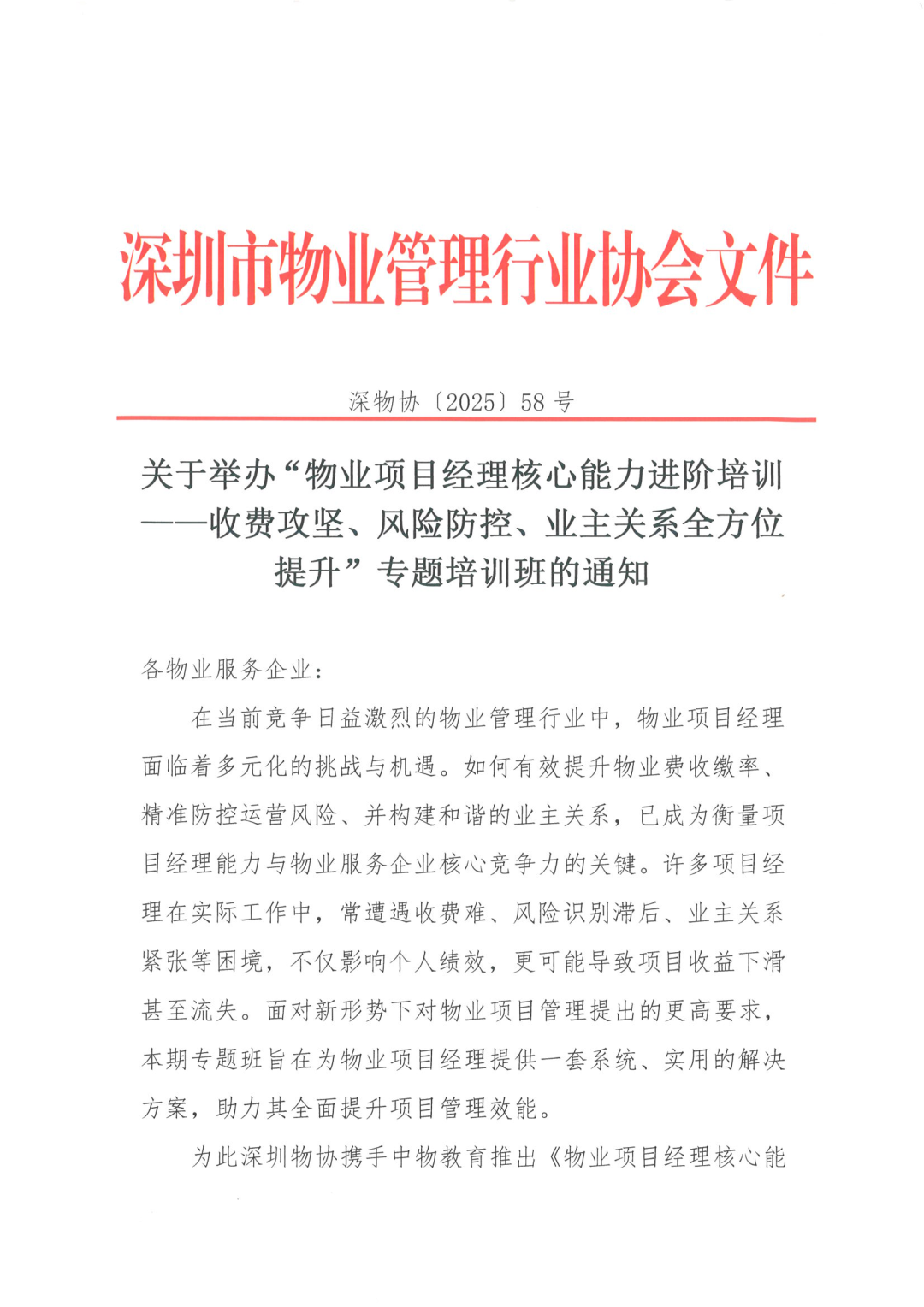 关于举办“物业项目经理核心能力进阶培训——收费攻坚、风险防控、业主关系全方位提升”专题培训班的通知