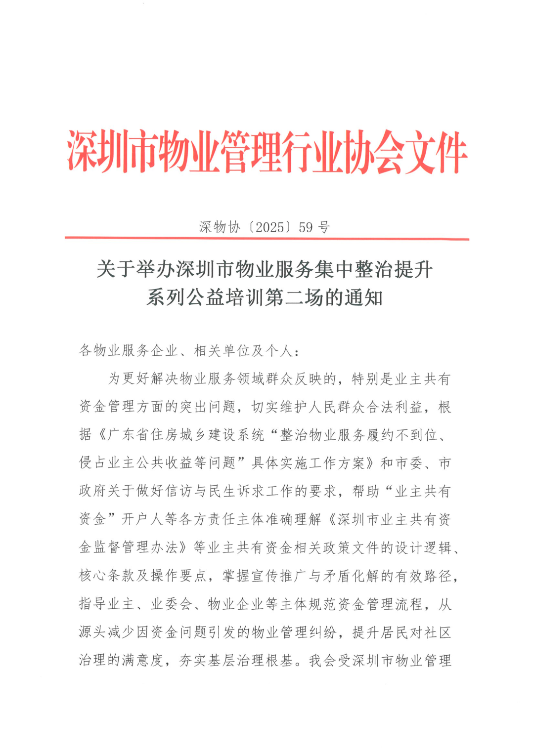 关于举办深圳市物业服务集中整治提升系列公益培训第二场的通知
