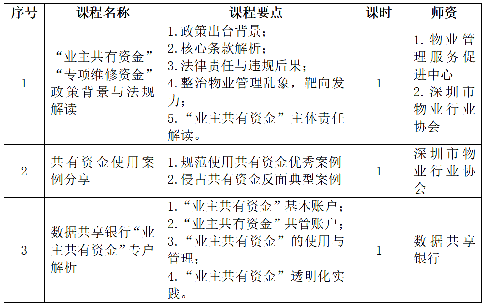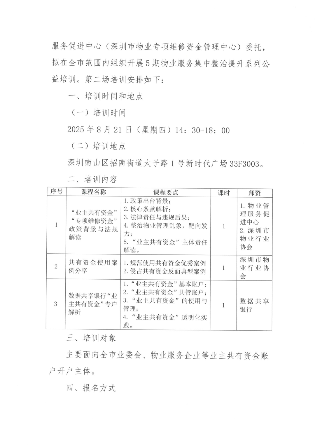 为更好解决物业服务领域群众反映的,特别是业主共有资金管理方面的突出问题,切实维护人民群众合法利益,根据《广东省住房城乡建设系统“整治物业服务履约不到位、侵占业主公共收益等问题”具体实施工作方案》和市委、市政府关于做好信访与民生诉求工作的要求,帮助“业主共有资金”开户人等各方责任主体准确理解《深圳市业主共有资金监督管理办法》等业主共有资金相关政策文件的设计逻辑、核心条款及操作要点,掌握宣传推广与矛盾化解的有效路径,指导业主、业委会、物业企业等主体规范资金管理流程,从源头减少因资金问题引发的物业管理纠纷,提升居民对社区治理的满意度,夯实基层治理根基。我会受深圳市物业管理服务促进中心(深圳市物业专项维修资金管理中心)委托,拟在全市范围内组织开展5期物业服务集中整治提升系列公益培训。第二场培训安排如下: 2025年8月21日(星期四)14:30-18:00 深圳南山区招商街道太子路1号新时代广场33F3003。