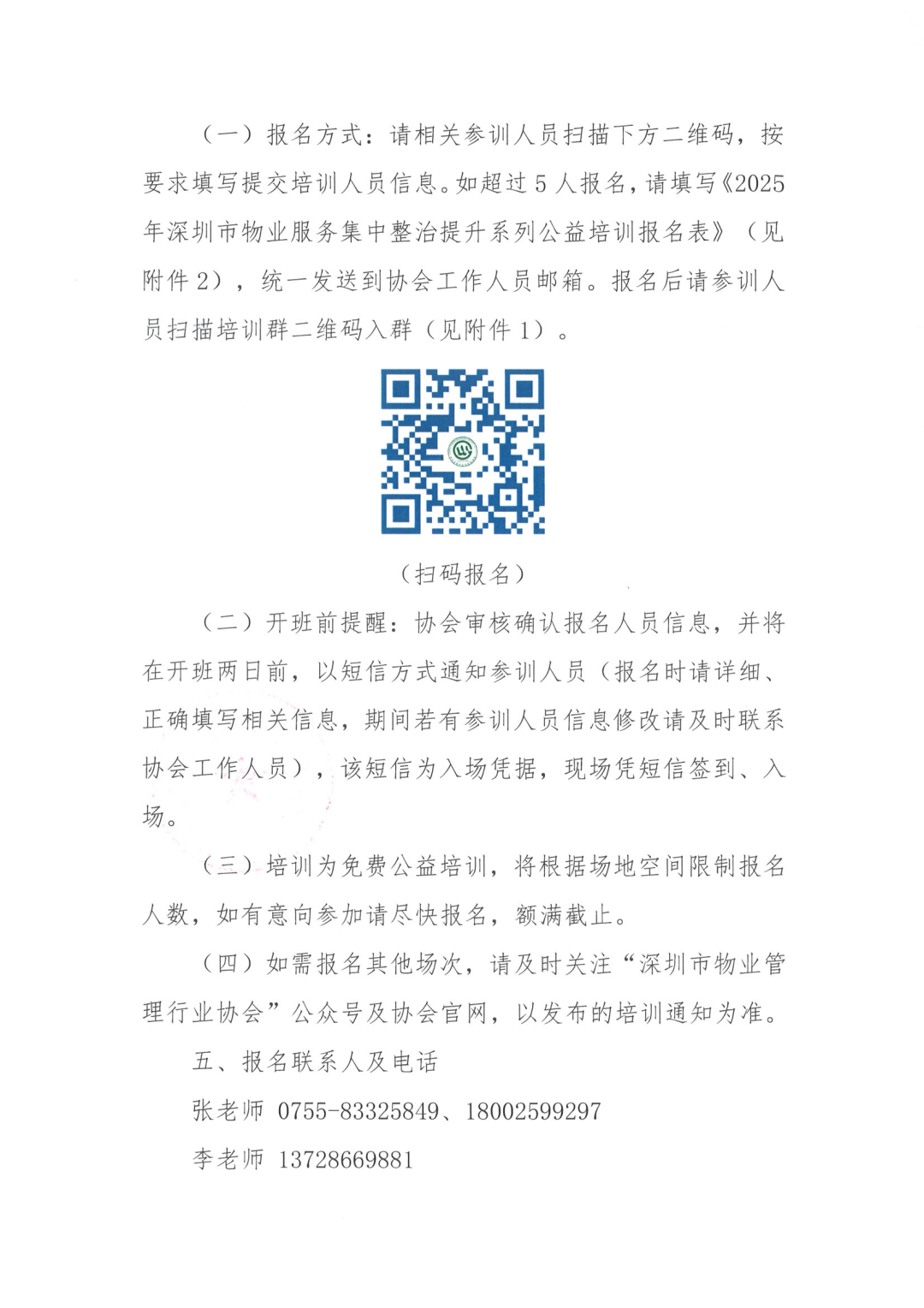 (二)开班前提醒:协会审核确认报名人员信息,并将在开班两日前,以短信方式通知参训人员(报名时请详细、正确填写相关信息,期间若有参训人员信息修改请及时联系协会工作人员),该短信为入场凭据,现场凭短信签到、入场。 (三)培训为免费公益培训,将根据场地空间限制报名人数,如有意向参加请尽快报名,额满截止。 (四)如需报名其他场次,请及时关注“深圳市物业管理行业协会”公众号及协会官网,以发布的培训通知为准。 张老师 0755-83325849、18002599297 2、《2025年深圳市物业服务集中整治提升系列公益培训报名表》通知原文如下: