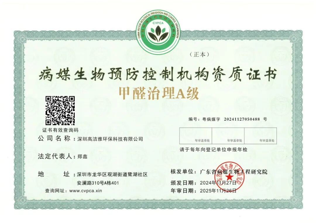 深圳高洁雅环保科技有限公司创始于2006年,集研发、设计、生产、销售、服务为一体的室内空气污染治理高新技术企业。业务范围覆盖:空气污染检测与治理,开荒保洁,防白蚁,除四害,美缝工程、室内空气净化产品源头厂家。是中国知名的室内空气污染治理整体解决服务商,公司自主研发空气污染测试治理产品+服务为一体,全方面解决室内空气污染问题。