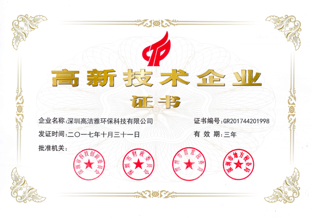 高洁雅总部位于深圳市龙华区,拥有行业先进的生产设备和雄厚的技术力量,以及严格的品质管理体系,秉承“质量第一,信誉至上”的理念方针,强力保证了产品的质量,企业始终以“改善室内空气质量,提高健康生活品质”为责任,凭借精良检测治理设备,专业化的工程队伍,合理的报价,以及优质的售后服务,赢得了全国各地客户的广泛认可和赞誉,众多知名企业及政府单位均已选择高洁雅是最好的见证。技术创新是高洁雅的一大优势。引进和吸收国际先进技术,成功研发出光触媒全味净、汽车除味剂、装修除味剂、植物除醛王、异味除味剂、汽车光触媒、除醛除味果冻和空气净化器等各种治理产品。并荣获多项荣誉与权威机构认证,室内空气污染治理方面具有全国双甲级施工资质。室内环境污染净化治理工程甲级证书