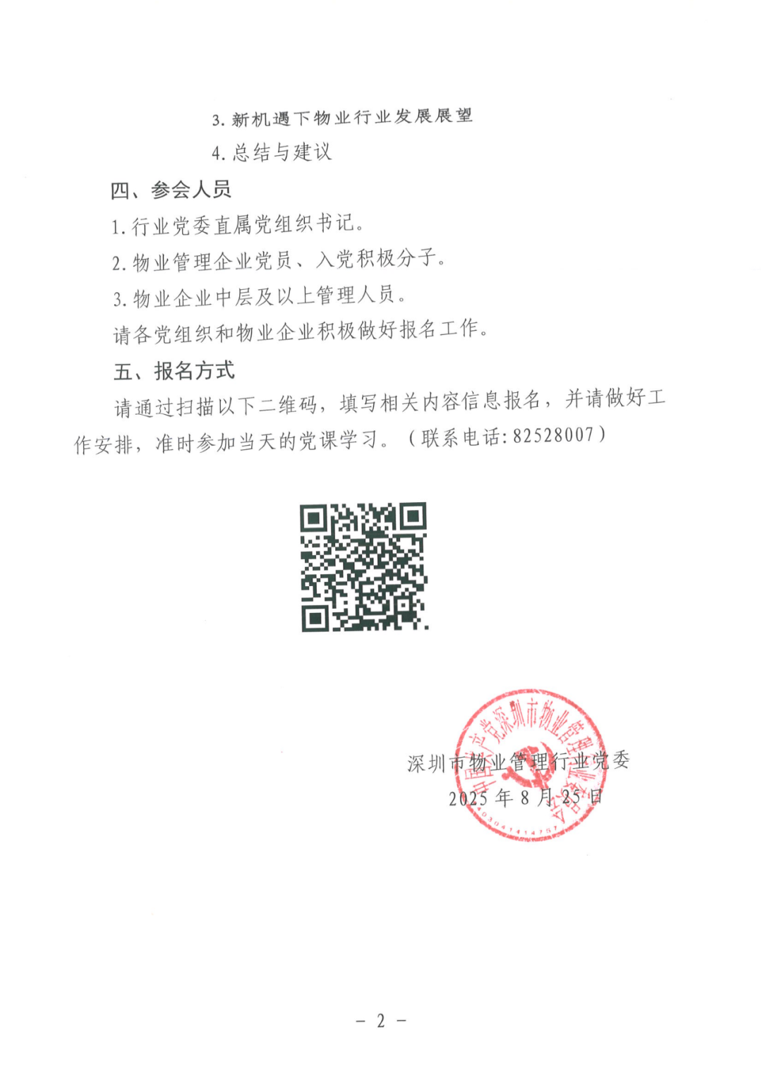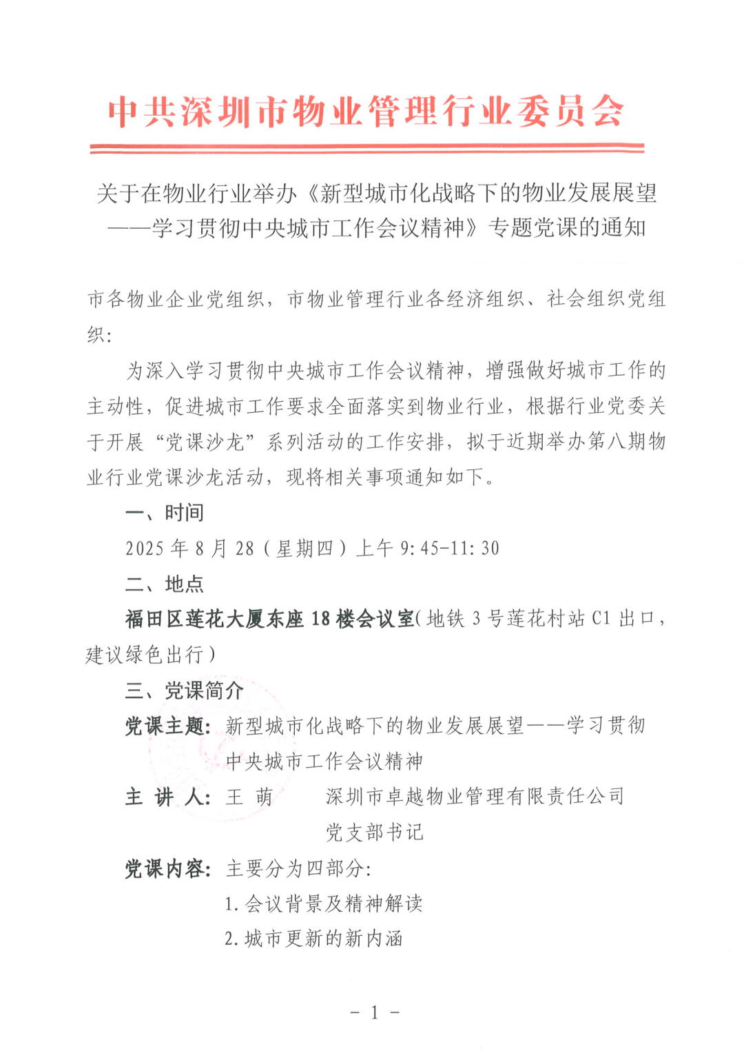 为深入学习贯彻中央城市工作会议精神,增强做好城市工作的主动性,促进城市工作要求全面落实到物业行业,根据行业党委关于开展“党课沙龙”系列活动的工作安排,拟于近期举办第八期物业行业党课沙龙活动,现将相关事项通知如下。 2025年8月28(星期四)上午9:45-11:30 福田区莲花大厦东座18楼会议室(地铁3号莲花村站C1出口,建议绿色出行) 党课主题:新型城市化战略下的物业发展展望——学习贯彻中央城市工作会议精神 主 讲 人:王 萌 深圳市卓越物业管理有限责任公司党支部书记 请通过扫描以下二维码,填写相关内容信息报名,并请做好工作安排,准时参加当天的党课学习。(联系电话:82528007)