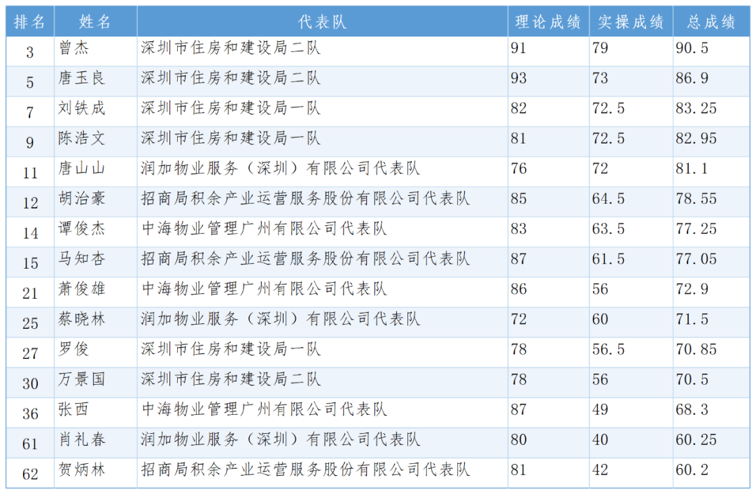 深圳市物业管理行业协会副会长、深圳市中旅联合物业管理有限公司副总经理范鹏举荣获“优秀技术指导奖”本次竞赛为省级一类竞赛,旨在深入贯彻习近平总书记关于技能人才工作的重要指示批示精神,贯彻落实《中共中央 国务院关于深化产业工人队伍建设改革的意见》,认真落实省委、省政府关于新时期产业工人队伍建设改革的决策部署,充分发挥职业技能竞赛对深化产业工人队伍建设改革和加强新时代高技能人才队伍建设的作用。活动共设建筑施工安全员、智能楼宇管理员、生活垃圾清运工等3个赛项,面向从业职工,各赛项参赛队3名选手的个人总成绩之和为团体总成绩。
