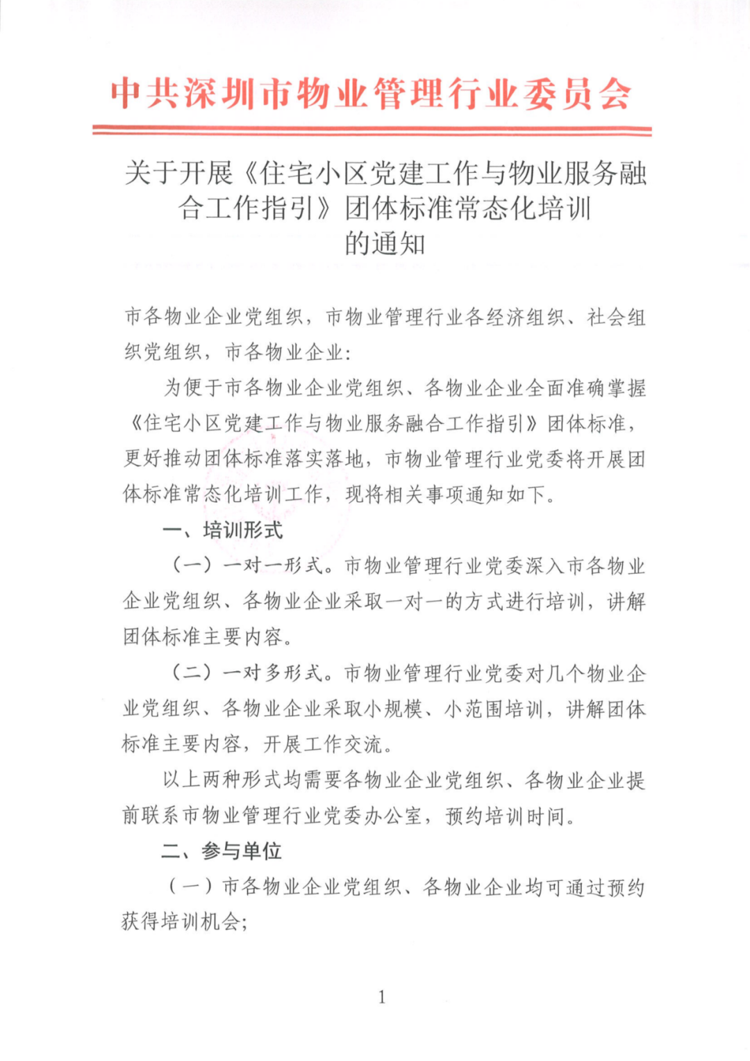 关于开展《住宅小区党建工作与物业服务融合工作指引》团体标准常态化培训的通知
