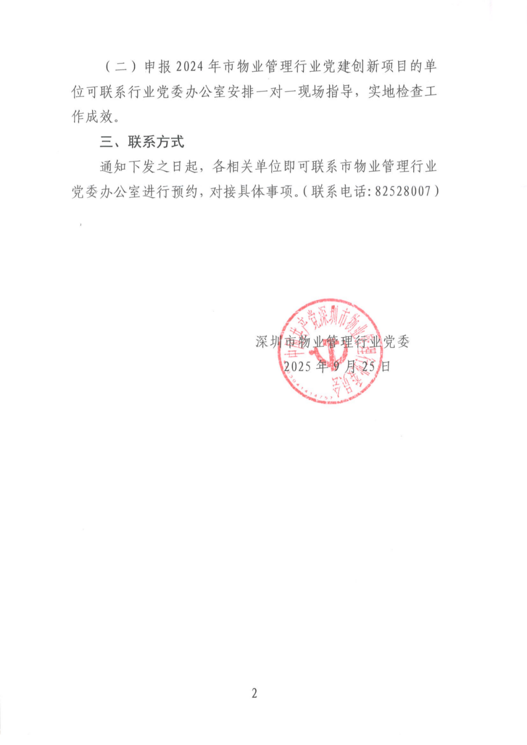 为便于市各物业企业党组织、各物业企业全面准确掌握《住宅小区党建工作与物业服务融合工作指引》团体标准,更好推动团体标准落实落地,市物业管理行业党委将开展团体标准常态化培训工作,现将相关事项通知如下。 (一)一对一形式。市物业管理行业党委深入市各物业企业党组织、各物业企业采取一对一的方式进行培训,讲解团体标准主要内容。 (二)一对多形式。市物业管理行业党委对几个物业企业党组织、各物业企业采取小规模、小范围培训,讲解团体标准主要内容,开展工作交流。 以上两种形式均需要各物业企业党组织、各物业企业提前联系市物业管理行业党委办公室,预约培训时间。 (一)市各物业企业党组织、各物业企业均可通过预约获得培训机会; (二)申报2024年市物业管理行业党建创新项目的单位可联系行业党委办公室安排一对一现场指导,实地检查工作成效。 通知下发之日起,各相关单位即可联系市物业管理行业党委办公室进行预约,对接具体事项。(联系电话:82528007)通知原文如下: