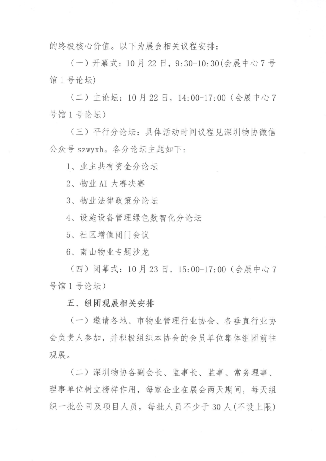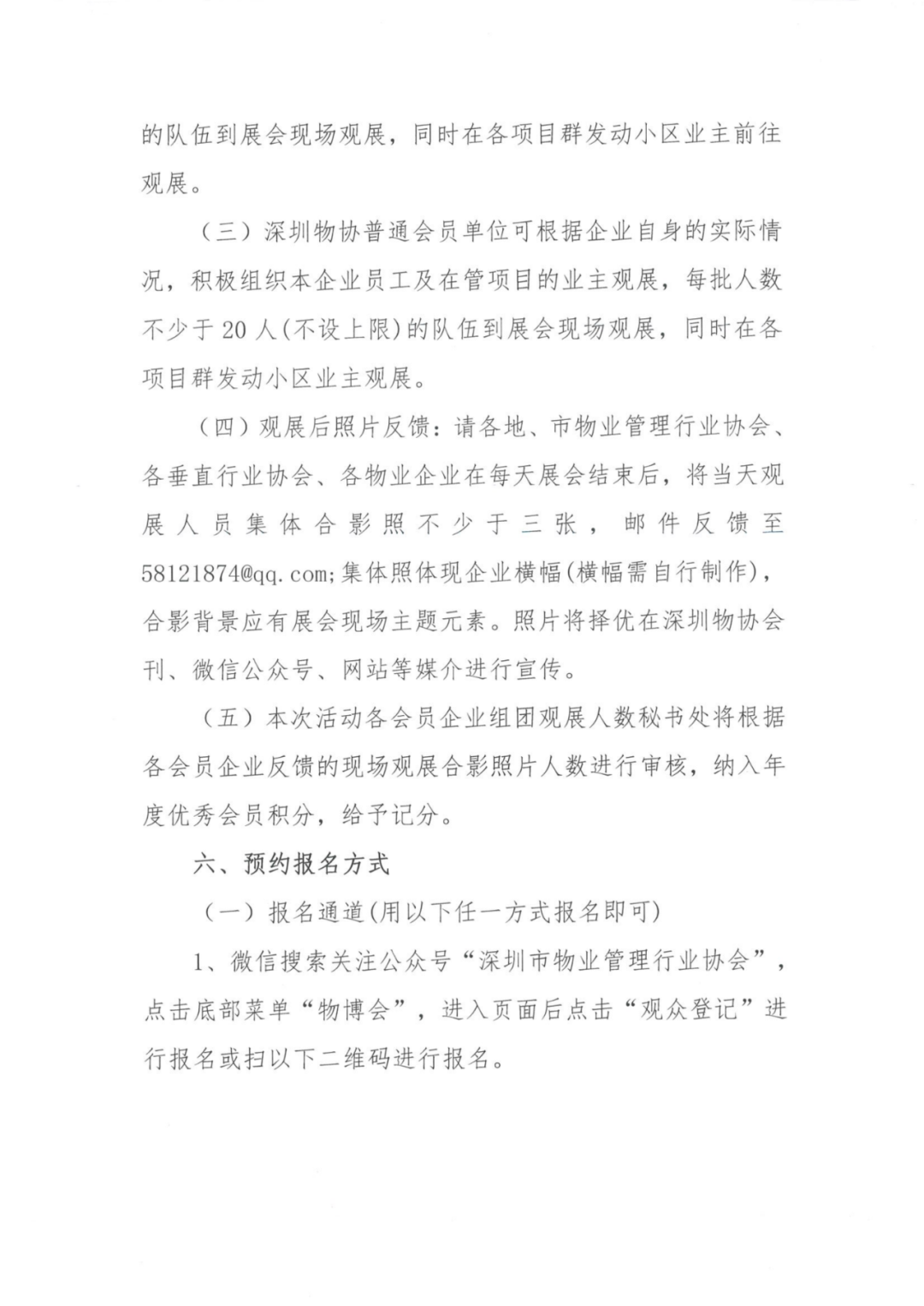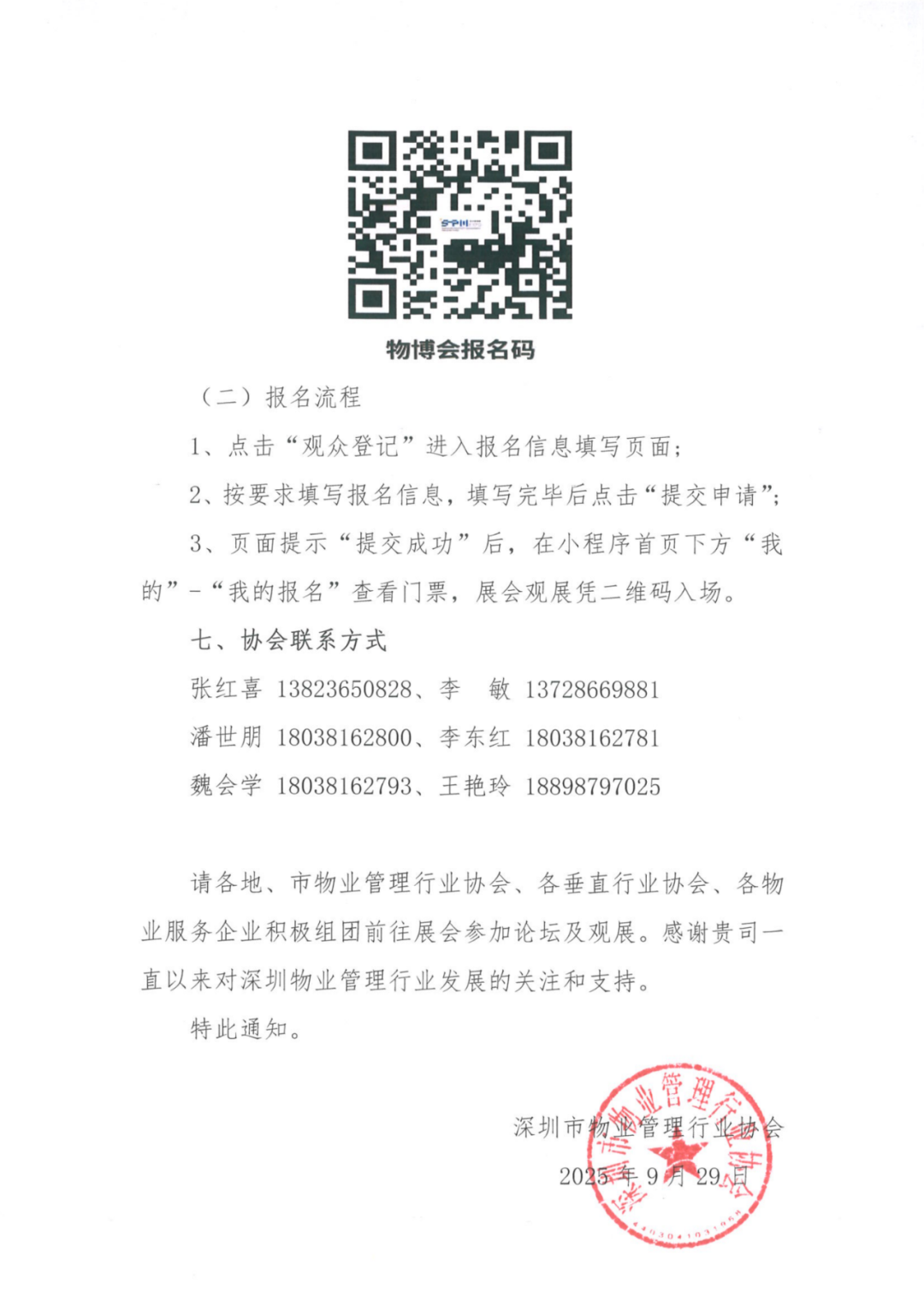 各地、市物业管理行业协会、各垂直行业协会、各物业服务企业、各相关单位: 为深入贯彻落实行业高质量发展要求,推动大数据、人工智能等新技术与物业美好生活服务深度融合,拓宽行业交流合作渠道,学习前沿管理经验与技术成果,“2025深圳国际物业管理产业博览会暨深圳高端物业及海外房地产投资展”(以下简称“2025深圳物博会”)将于2025年10月22至23日在深圳福田会展中心举办。我会作为展会的主办单位,诚挚邀请各地行业协会(学会)及会员单位、物业服务企业、上下游产业链企业积极参与,为确保本次展会成功有序举办,现将有关事项通知如下: 地点:深圳福田会展中心7、8号展馆(福田区福华三路) 诚挚邀请各地方物业管理协会、物业服务企业和各参展单位,组织业主与客户代表团观摩展会,包括但不限于以下对象: 本次展会以终为始,坚持“物业管理+”原则,力争贯通不动产全产业链,连接拉通终端社区美好生活服务,现场完美即时演绎物业管理的价值谱系,自主生动呈现物业管理的终极核心价值。以下为展会相关议程安排: (一)开幕式:10月22日,9:30-10:30(会展中心7号馆1号论坛) (二)主论坛:10月22日,14:00-17:00(会展中心7号馆1号论坛) (三)平行分论坛:具体活动时间议程见深圳物协微信公众号szwyxh。各分论坛主题如下: (四)闭幕式:10月23日,15:00-17:00(会展中心7号馆1号论坛) (一)邀请各地、市物业管理行业协会、各垂直行业协会负责人参加,并积极组织本协会的会员单位集体组团前往观展。 (二)深圳物协各副会长、监事长、监事、常务理事、理事单位树立榜样作用,每家企业在展会两天期间,每天组织一批公司及项目人员,每批人员不少于30人(不设上限)的队伍到展会现场观展,同时在各项目群发动小区业主前往观展。 (三)深圳物协普通会员单位可根据企业自身的实际情况,积极组织本企业员工及在管项目的业主观展,每批人数不少于20人(不设上限)的队伍到展会现场观展,同时在各项目群发动小区业主观展。 (四)观展后照片反馈:请各地、市物业管理行业协会、各垂直行业协会、各物业企业在每天展会结束后,将当天观展人员集体合影照不少于三张,邮件反馈至58121874@qq.com;集体照体现企业横幅(横幅需自行制作),合影背景应有展会现场主题元素。照片将择优在深圳物协会刊、微信公众号、网站等媒介进行宣传。 (五)本次活动各会员企业组团观展人数秘书处将根据各会员企业反馈的现场观展合影照片人数进行审核,纳入年度优秀会员积分,给予记分。 1、微信搜索关注公众号“深圳市物业管理行业协会”,点击底部菜单“物博会”,进入页面后点击“观众登记”进行报名或扫以下二维码进行报名。