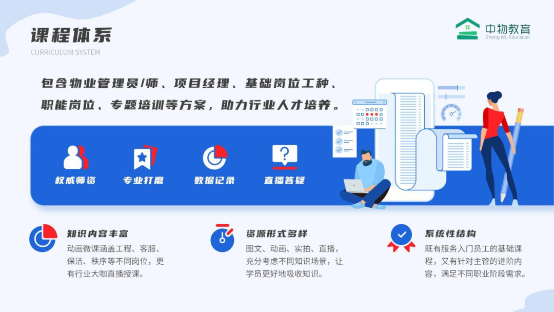中物教育将展示其精心打造的多元化课程体系,涵盖物业管理员/师、项目经理、基础岗位工种、职能岗位及专题培训等多个领域。通过图文、动画、实拍、直播等多种教学形式,为不同职业阶段的学员提供量身定制的学习方案,助力行业人才全面发展,提升专业素养与综合能力。中物教育的智能化在线学习平台,集课程学习、考试测评、社群互动、游戏化运营等多功能于一体,支持多终端同步学习,实现培训效果的实时追踪与全面考核。平台利用大数据分析与智能推荐技术,为学员提供个性化学习路径,让学习更加高效、有趣。