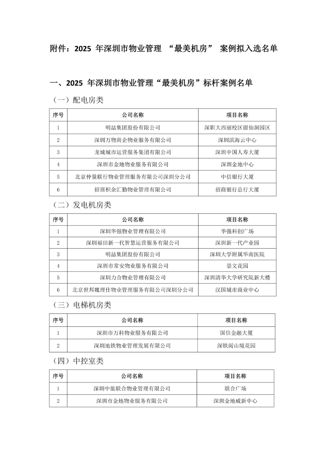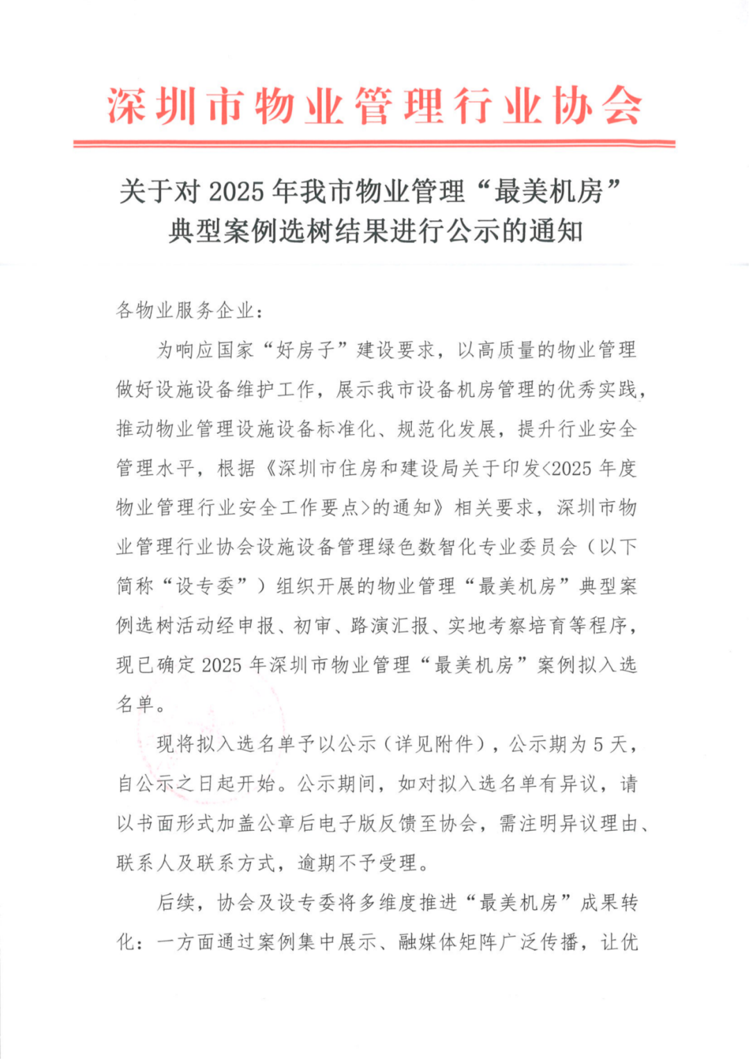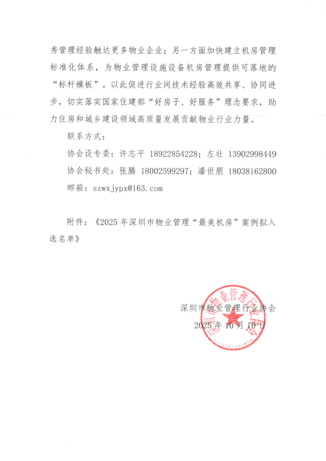 2025 年深圳市物业管理 “最美机房”案例拟入选名单。 现将拟入选名单予以公示(详见附件),公示期为5天,自公示之日起开始。公示期间,如对拟入选名单有异议,请以书面形式加盖公章后电子版反馈至协会,需注明异议理由、联系人及联系方式,逾期不予受理。 后续,协会及设专委将多维度推进“最美机房”成果转化:一方面通过案例集中展示、融媒体矩阵广泛传播,让优秀管理经验触达更多物业企业;另一方面加快建立机房管理标准化体系,为物业管理设施设备机房管理提供可落地的“标杆模板”。以此促进行业间技术经验高效共享、协同进步,切实落实国家住建部“好房子、好服务”理念要求,助力住房和城乡建设领域高质量发展贡献物业行业力量。 协会设专委:许志平 18922854228;左壮 13902998449 协会秘书处:张腾 18002599297;潘世朋 18038162800 附件:2025年深圳市物业管理“最美机房”案例拟入选名单通知原文如下: