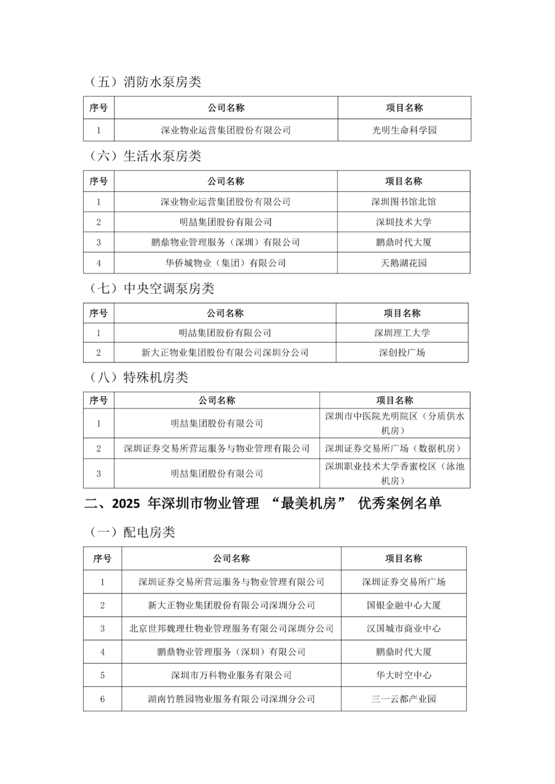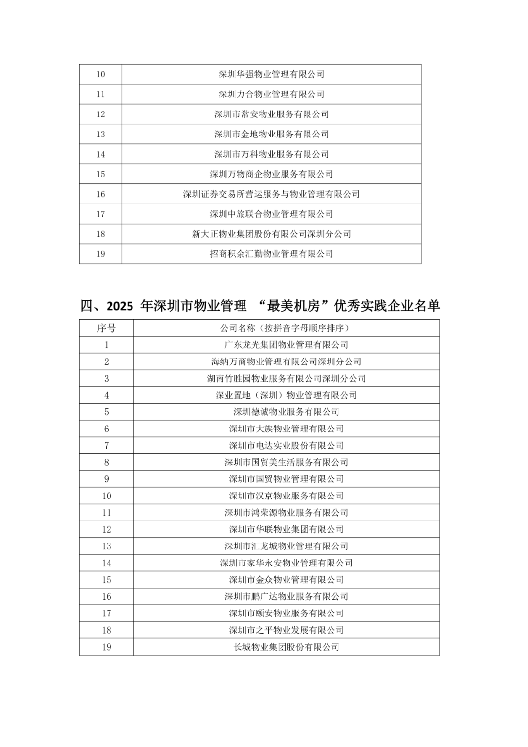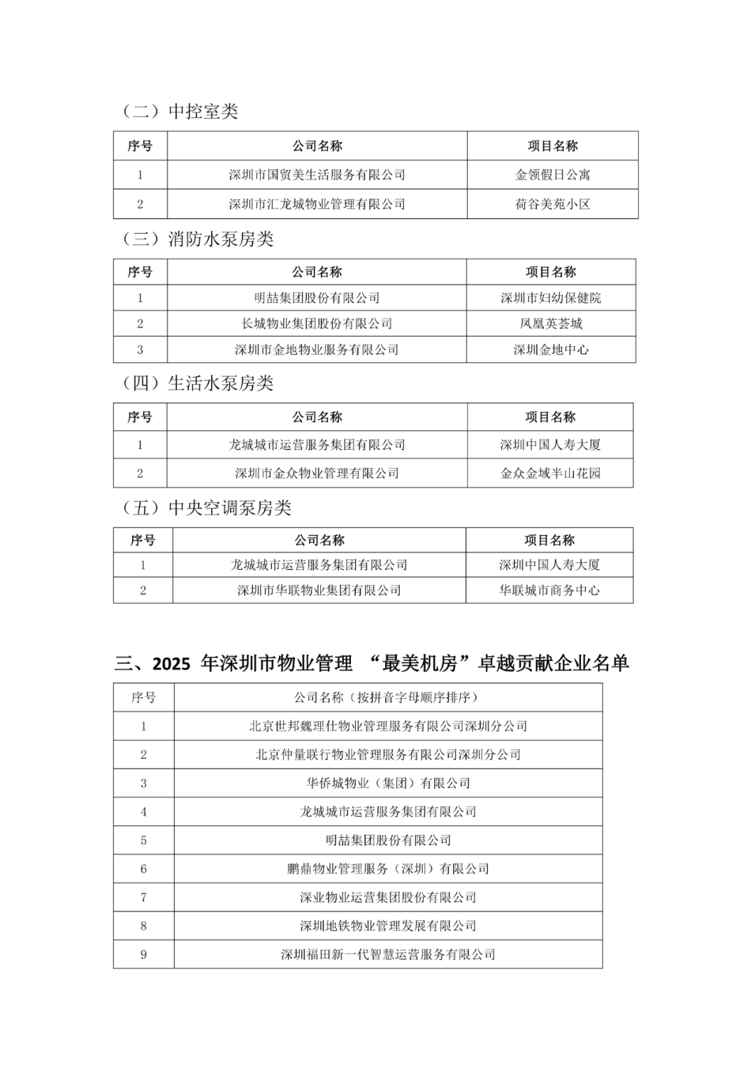 2025 年深圳市物业管理 “最美机房”案例拟入选名单。 现将拟入选名单予以公示(详见附件),公示期为5天,自公示之日起开始。公示期间,如对拟入选名单有异议,请以书面形式加盖公章后电子版反馈至协会,需注明异议理由、联系人及联系方式,逾期不予受理。 后续,协会及设专委将多维度推进“最美机房”成果转化:一方面通过案例集中展示、融媒体矩阵广泛传播,让优秀管理经验触达更多物业企业;另一方面加快建立机房管理标准化体系,为物业管理设施设备机房管理提供可落地的“标杆模板”。以此促进行业间技术经验高效共享、协同进步,切实落实国家住建部“好房子、好服务”理念要求,助力住房和城乡建设领域高质量发展贡献物业行业力量。 协会设专委:许志平 18922854228;左壮 13902998449 协会秘书处:张腾 18002599297;潘世朋 18038162800 附件:2025年深圳市物业管理“最美机房”案例拟入选名单通知原文如下: