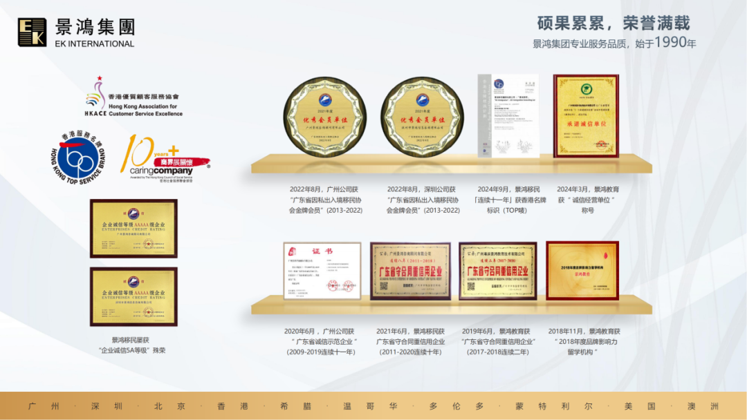 景鸿集团拥有经验丰富的国际服务网络,包括有景鸿移民、景鸿教育、景鸿汇等多个实力品牌,分支机构遍布中国香港、广州、深圳、北京;加拿大温哥华、多伦多、蒙特利尔以及澳洲、希腊、美国等国家及地区。集团业务涉及移民申请、旅游签证、留学签证、名校报读等,形成集专业咨询、申请指导、安家就业等环环相扣的多元化服务,其旨在以全方位一站式的服务,让客户移民海外生活、提升教育背景、实现财富增值等目标-一兑现,助客户踏上人生的新里程。在香港投资3000万港币,顺便拿个香港身份,一举两得,申请条件、续签要求简单,无工作或创业要求,7年后未达到转永居要求,可申请转“无条件限制逗留签证”。25万欧元起投资希腊房产,有房有租金收益还有身份,孩子高中在希腊读2年书后可以参加华侨生联考,400分可申请国内985、211知名大学。40万美金起购房获得土耳其公民身份,三年后房产可售,白得一本护照1.景鸿集团是香港人才服务窗口官方合作伙伴之一,拥有专业的顾问和文案团队,同时,申请个案经特聘香港项目专家审核后才递交申请,提高申请成功率。2.景鸿集团为高净值客户提供专属身份规划的同时,服务延伸至子女教育规划、税务优化及安家服务,形成 “身份 + 资产 + 生活” 的全方位解决方案。3.景鸿集团深耕移民行业三十余年,积累了大量的成功案例,拥有丰富的项目办理经验,熟悉各个项目的政策法规和申请流程,能够为客户提供专业的指导。