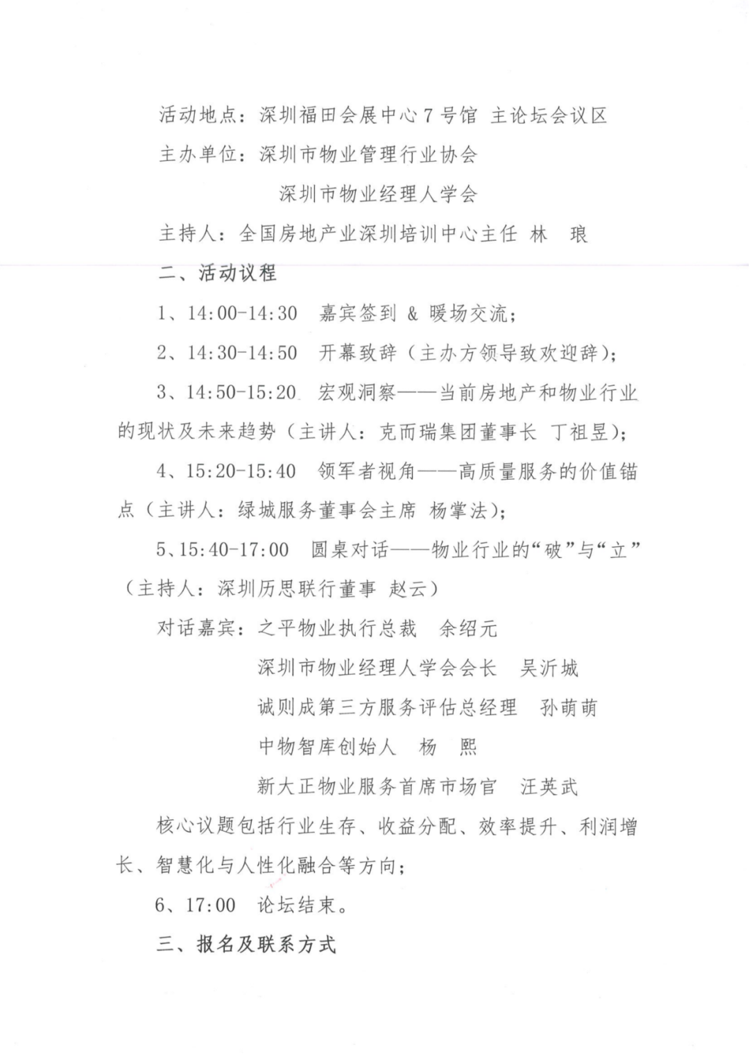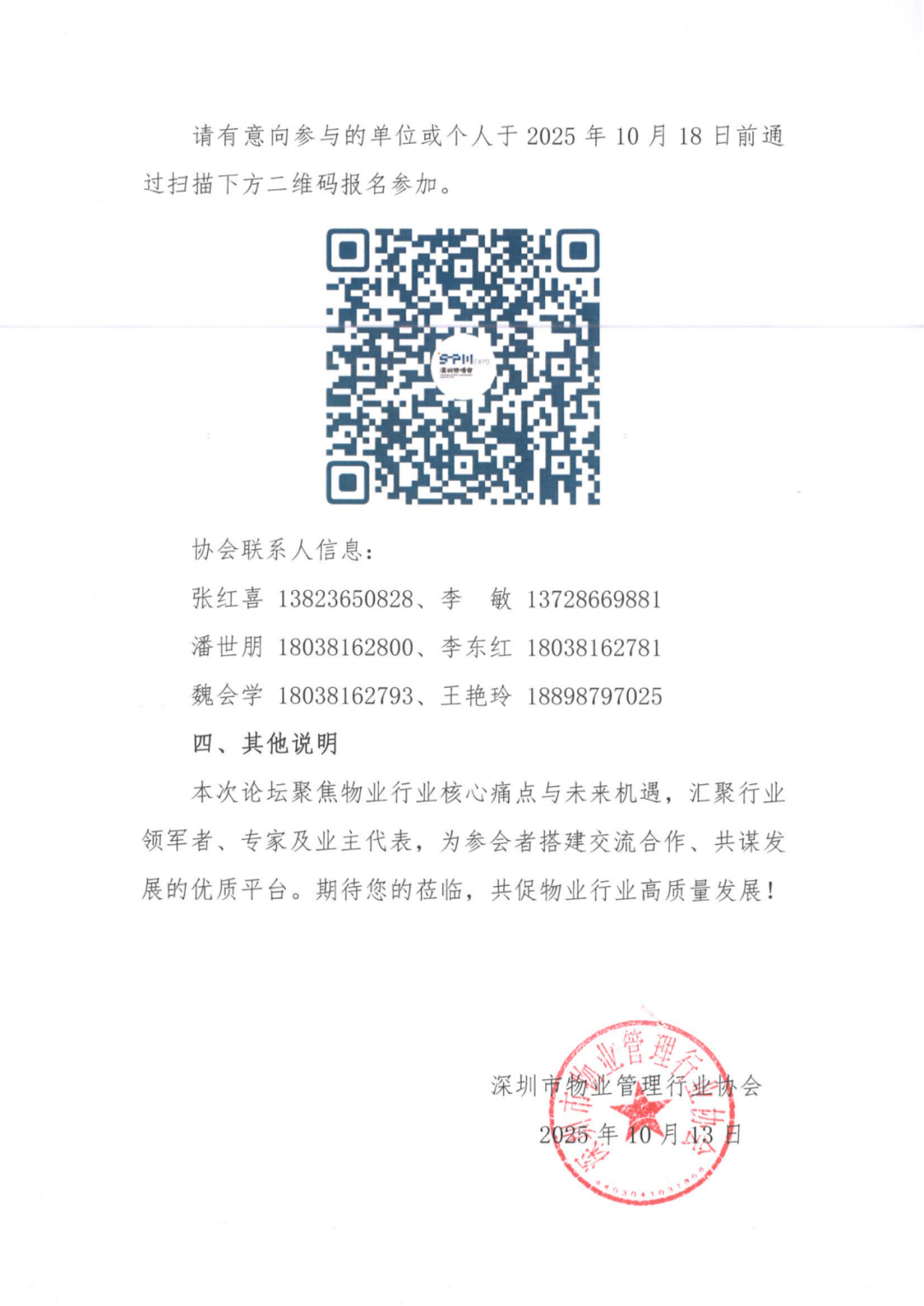 为探索物业行业高质量发展新路径,推动行业协同与创新,深圳市物业管理行业协会、深圳市物业经理人学会将联合举办“2025深圳国际物业管理产业高峰论坛暨第七届粤港澳大湾区物业管理创新发展论坛”。现诚邀您参与,共话行业未来,具体事宜通知如下: 活动主题:聚力协同,链动未来——探索物业行业高质量发展新路径 活动时间:2025年10月22日(星期三)14:30-17:00(14:00-14:30为嘉宾签到及暖场交流时间) 1、14:00-14:30 嘉宾签到 & 暖场交流; 2、14:30-14:50 开幕致辞(主办方领导致欢迎辞); 3、14:50-15:20 宏观洞察——当前房地产和物业行业的现状及未来趋势(主讲人:克而瑞集团董事长 丁祖昱); 4、15:20-15:40 领军者视角——高质量服务的价值锚点(主讲人:绿城服务董事会主席 杨掌法); 5、15:40-17:00 圆桌对话——物业行业的“破”与“立”(主持人:深圳历思联行董事 赵云) 核心议题包括行业生存、收益分配、效率提升、利润增长、智慧化与人性化融合等方向; 请有意向参与的单位或个人于2025年10月18日前通过扫描下方二维码报名参加。