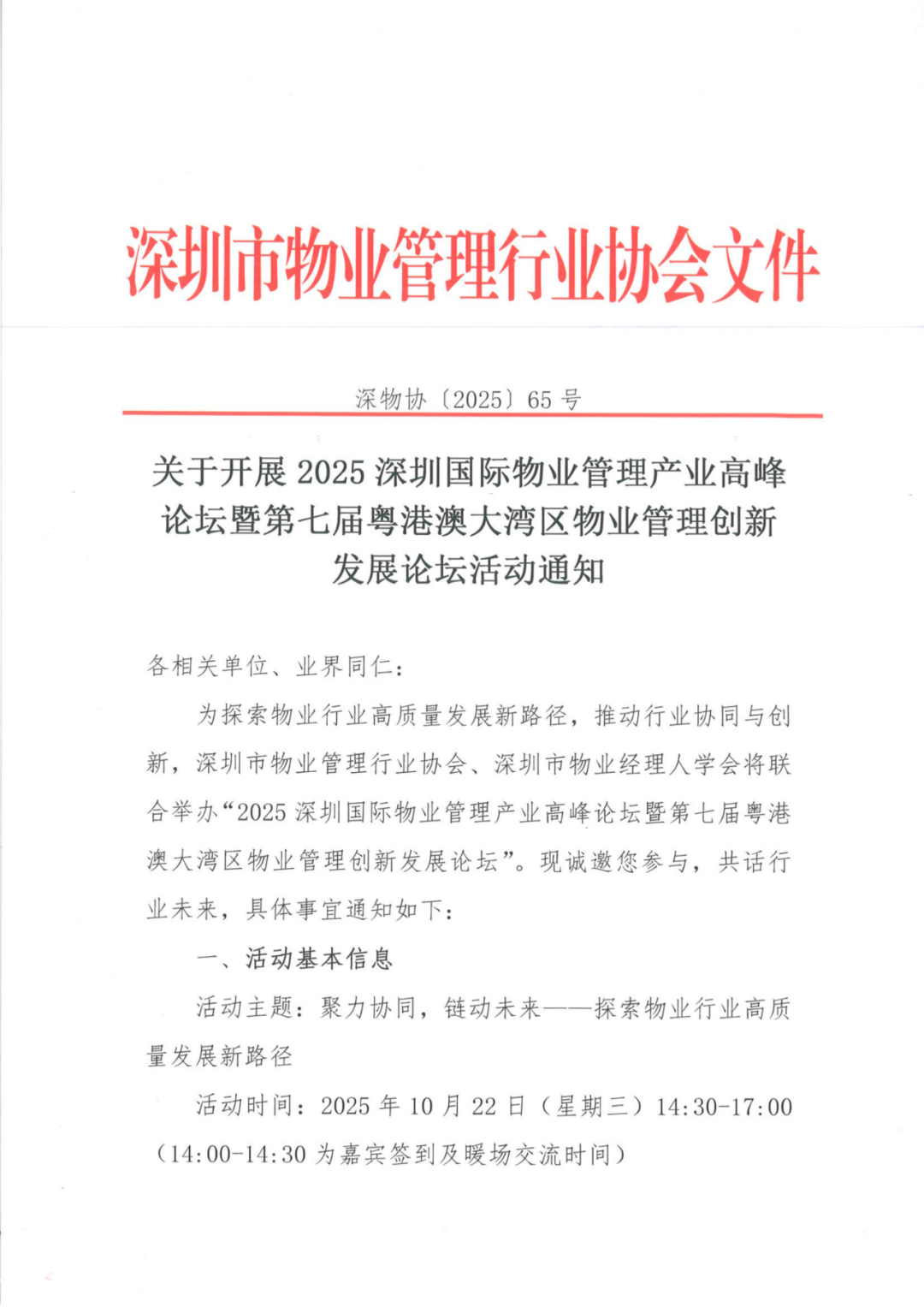 关于开展2025深圳国际物业管理产业高峰论坛暨第七届粤港澳大湾区物业管理创新发展论坛活动通知