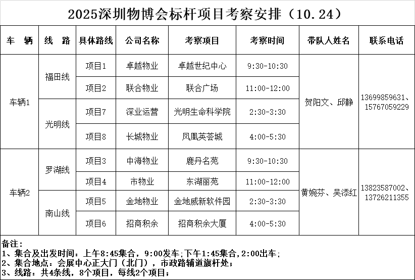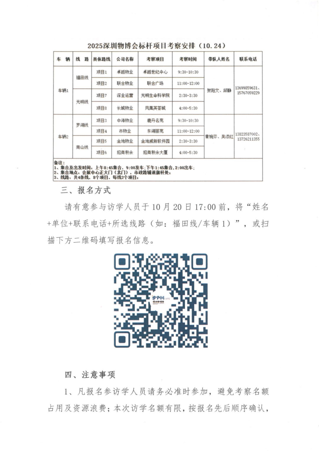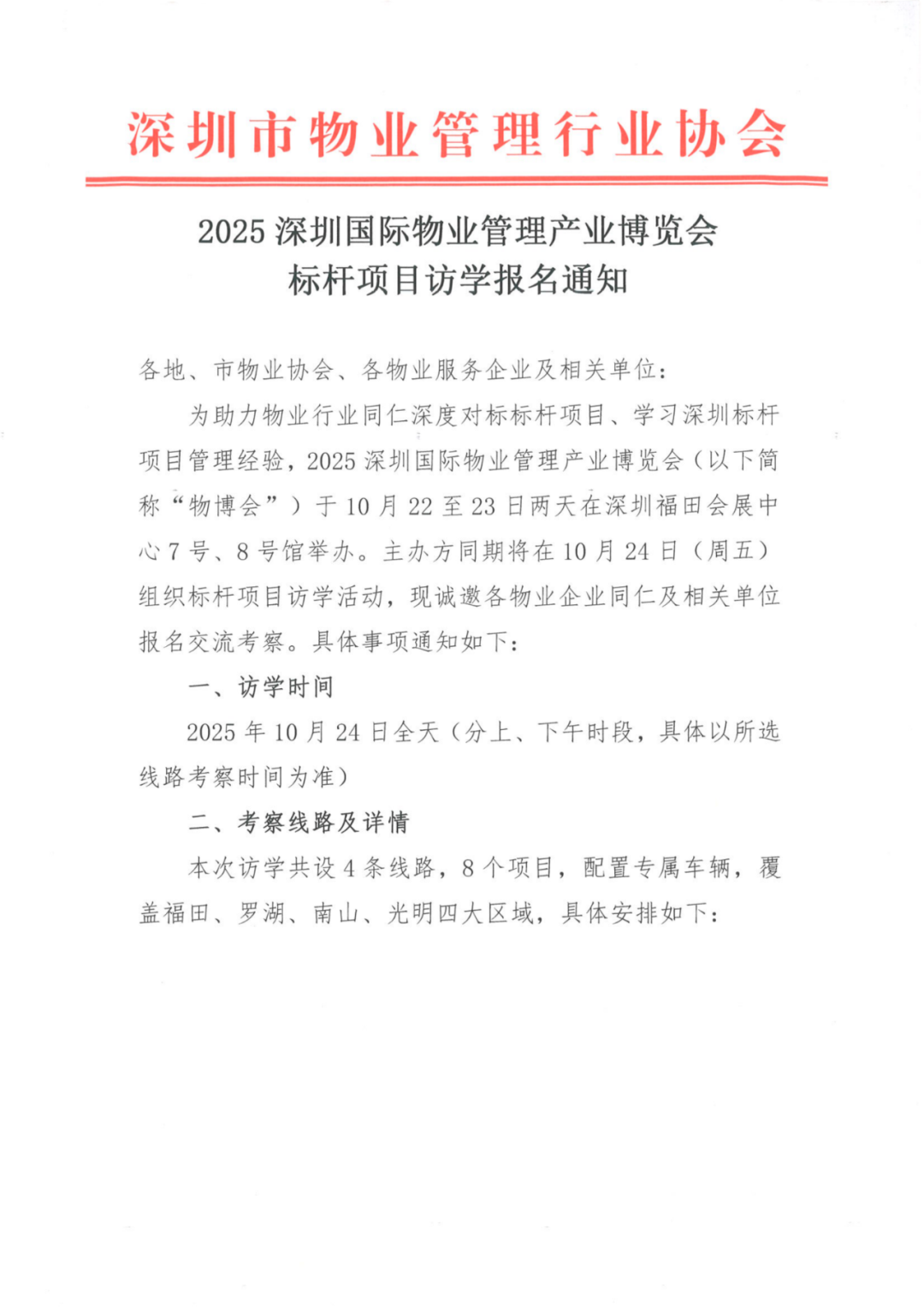 为助力物业行业同仁深度对标标杆项目、学习深圳标杆项目管理经验,2025深圳国际物业管理产业博览会(以下简称“物博会”)于10月22至23日两天在深圳福田会展中心7号、8号馆举办。主办方同期将在10月24日(周五)组织标杆项目访学活动,现诚邀各物业企业同仁及相关单位报名交流考察。具体事项通知如下: 2025年10月24日全天(分上、下午时段,具体以所选线路考察时间为准) 本次访学共设4条线路,8个项目,配置专属车辆,覆盖福田、罗湖、南山、光明四大区域,具体安排如下: