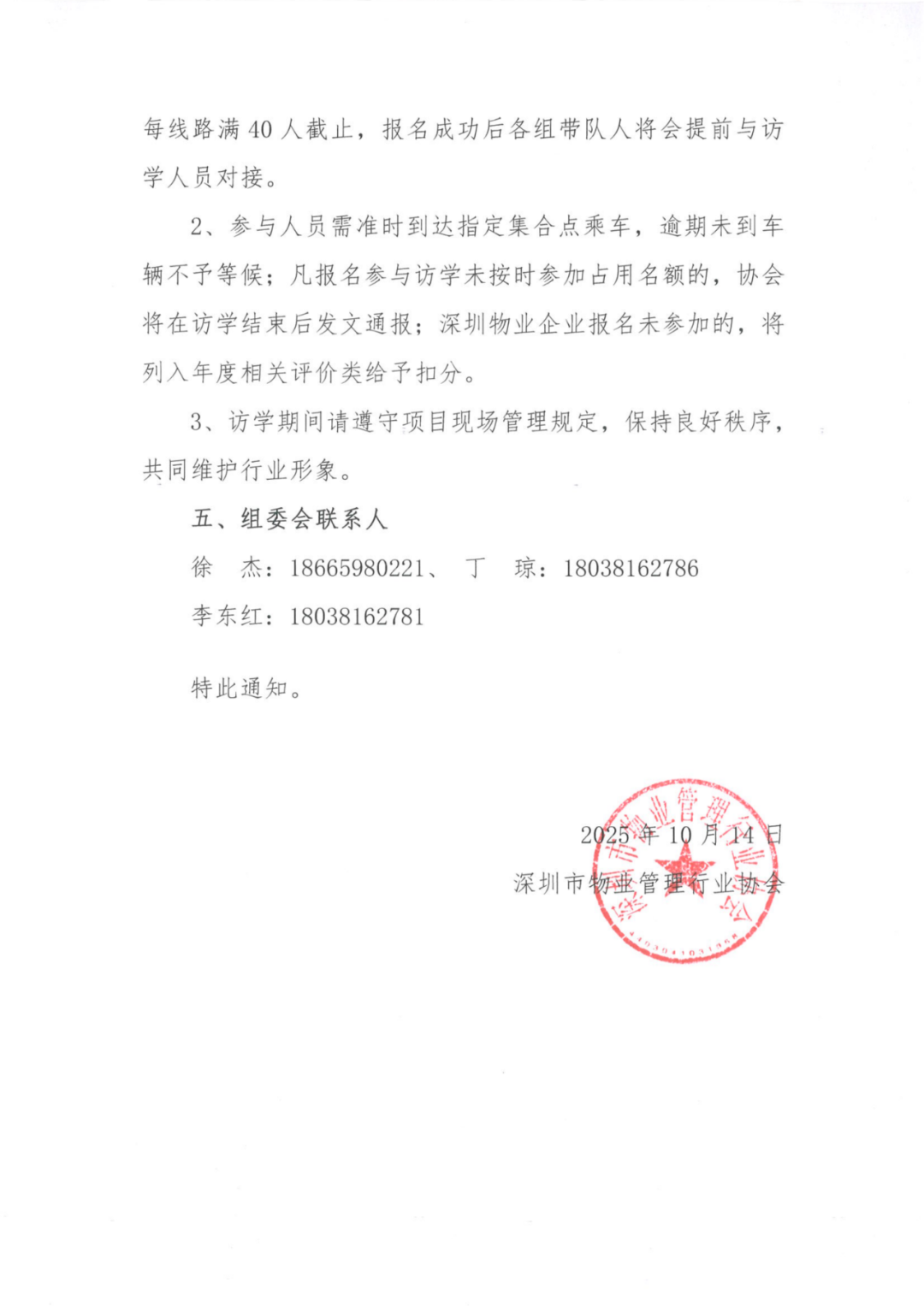 1、凡报名参访学人员请务必准时参加,避免考察名额占用及资源浪费;本次访学名额有限,按报名先后顺序确认,每线路满40人截止,报名成功后各组带队人将会提前与访学人员对接。 2、参与人员需准时到达指定集合点乘车,逾期未到车辆不予等候;凡报名参与访学未按时参加占用名额的,协会将在访学结束后发文通报;深圳物业企业报名未参加的,将列入年度相关评价类给予扣分。 3、访学期间请遵守项目现场管理规定,保持良好秩序,共同维护行业形象。 徐 杰:18665980221、 丁 琼:18038162786通知原文如下: