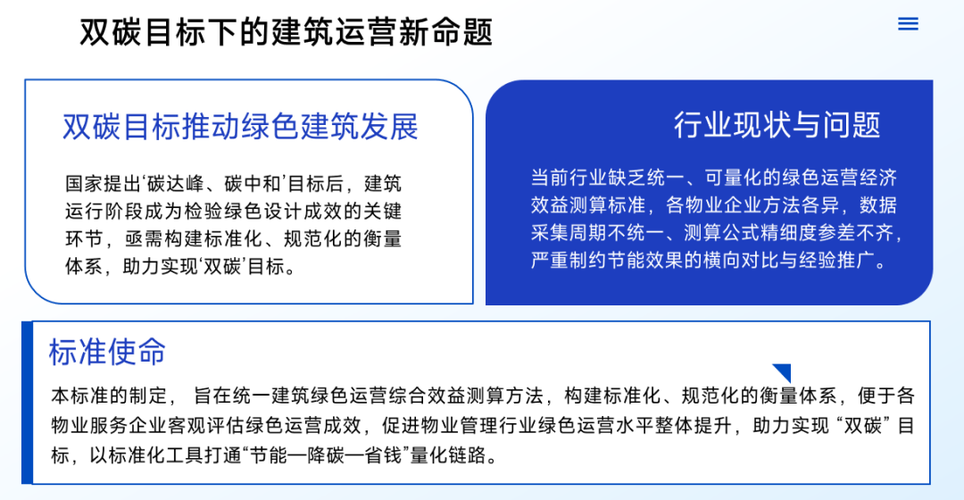 当前,物业服务企业在测算绿色运营效益时,普遍面临三大困局:1.方法各异,难以对标:各企业数据采集周期、测算公式精细度参差不齐,使得不同建筑之间的节能效果无法进行横向对比,优秀经验难以复制推广。2.视野局限,价值埋没:传统的评估多聚焦于直接的节能降费,而建筑在碳减排、绿色服务等方面的间接效益与社会价值一直被忽略,成为无法显化的“隐藏资产”。3.动力不足,缺乏引导:由于社会效益无法量化,物业单位投入管理和技术升级的积极性受挫,缺乏持续改进的明确导向和有效激励。本《指南》的制定,正是为了统一方法论、构建标准化衡量体系,让建筑的绿色运营成效变得可量化、可对比、可报告,从而激活物业单位的内生动力,为行业整体提升奠定坚实基础。